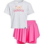 - Let your little one shine bright in the adidas® Kids Heather Tee & Flowy Short Set, a feel-good outfit made for everyday adventures. This charming two-piece set features a short sleeve tee with a cheerful floral bouquet print that adds a playful pop to their look. Designed with a classic crew neck, short sleeves, and a regular fit, the tee feels easy and breathable for all-day comfort. The matching flowy shorts are just as fun and functional, featuring a flat front, mid-rise waist, and a pull-on design for effortless dressing. A high-low hem layered over internal bike shorts offers extra coverage and confidence during active play. Crafted from soft jersey fabric, this set keeps kids comfy, while the encased elastic waistband ensures a secure yet flexible fit. Finished with subtle 3 Bar Logos, it blends sporty style with everyday charm.