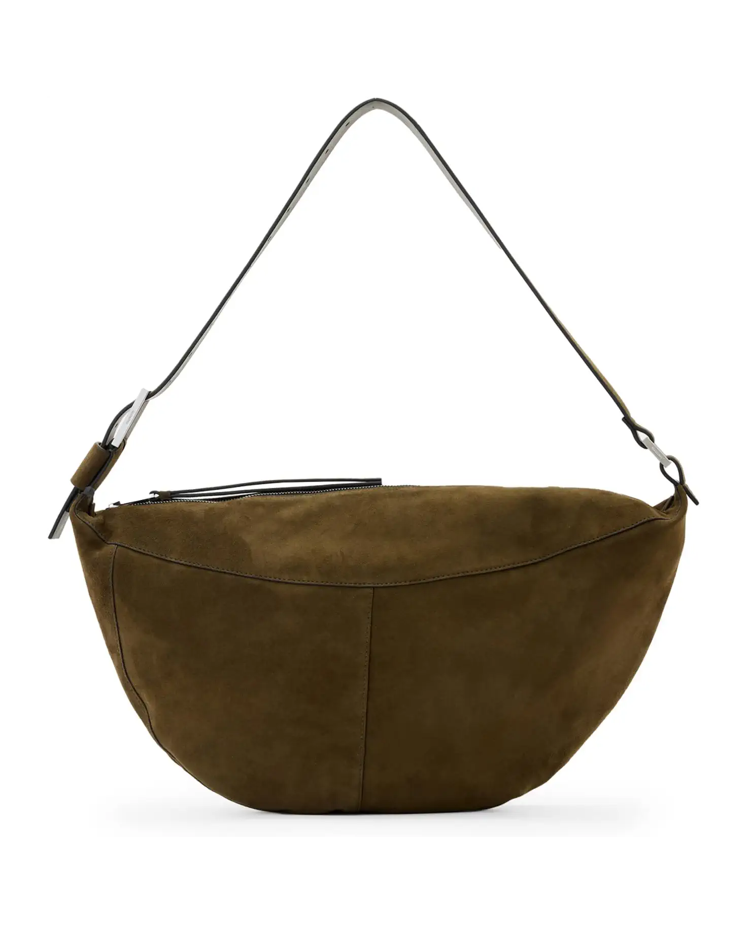 - Indulge in luxury carrying the AllSaints™ Luna Suede Shoulder Bag. Made from supple suede material, this bag boasts a modern crescent-shaped profile and a secure zippered top closure. The adjustable shoulder strap ensures a perfect fit, making it the ideal accessory for any occasion.
