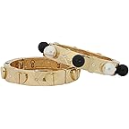 • One bangle features raised hearts with delicate rhinestone accents. The other bangle features white and black faux pearls with delicate rhinestone accents.