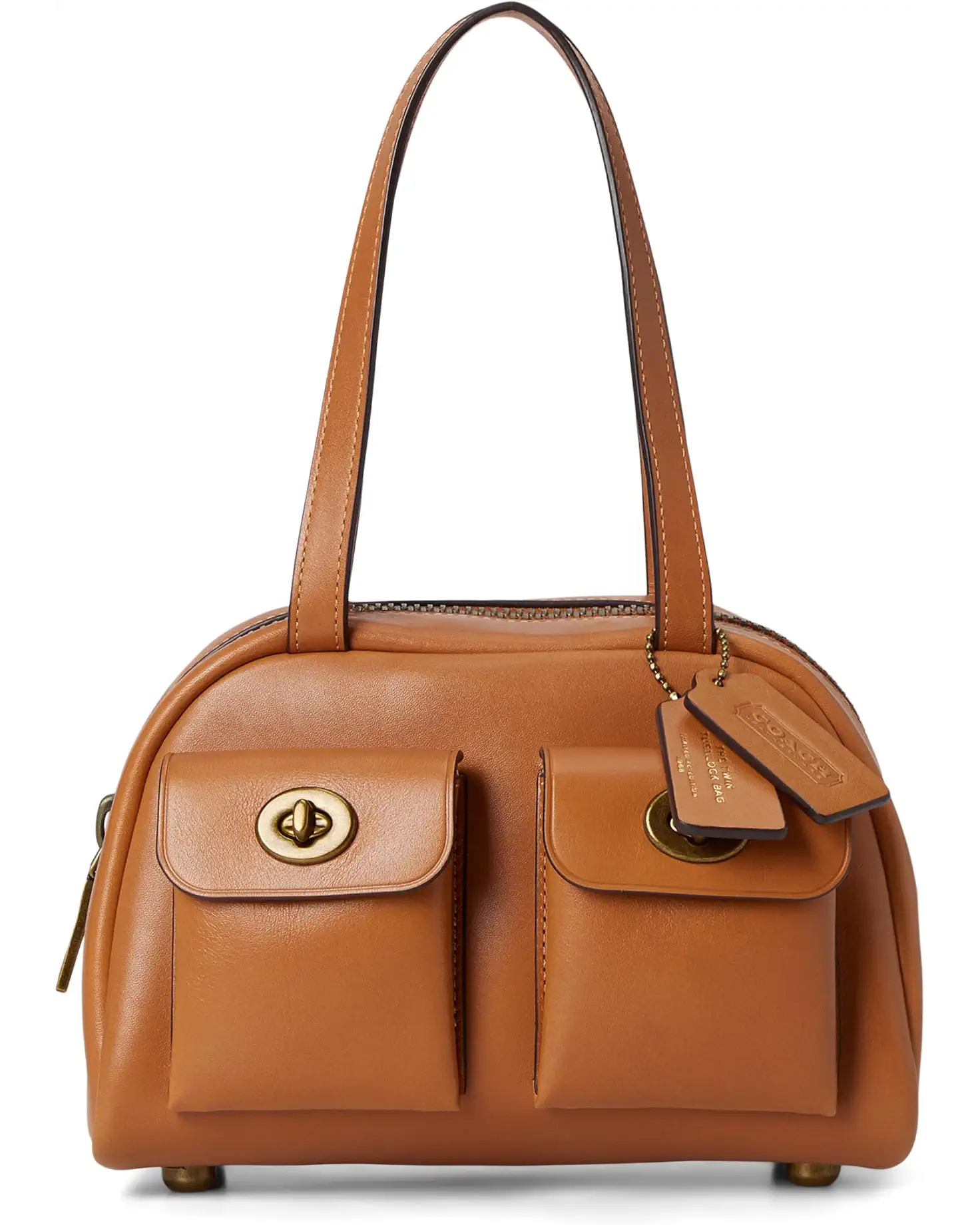 - The COACH™ Twin Turnlock Bag 20 is a hand-carry bag with four protective feet at the base for convenient carrying. Made from waxed smooth leather, this luggage bag is designed with dual grab handles and a zippered top closure. With its two outside turnlock pockets, an interior compartment, and an inside snap pocket, this leather bag offers enough space for all your essentials.
