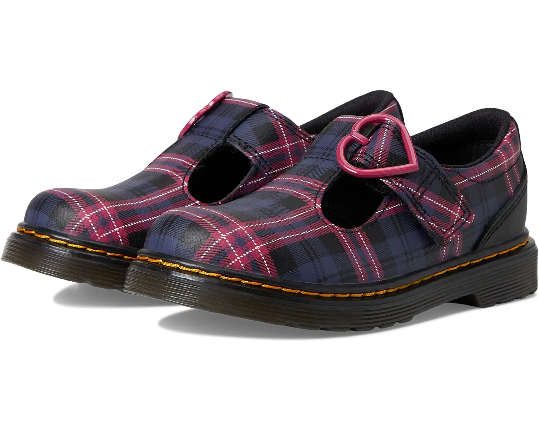 - Nothing says back to school like the Dr. Martens® Kid's Collection Polley II shoes. Made with Athena leather that has a smooth PU coating, these Mary Jane shoes have an adorable decorative heart-shaped buckle, a padded collar, an adjustable hook-and-loop strap, and a pop of plaid pattern. Their polyester insole and lining provide added comfort and breathability. These low-top shoes work for most occasions.