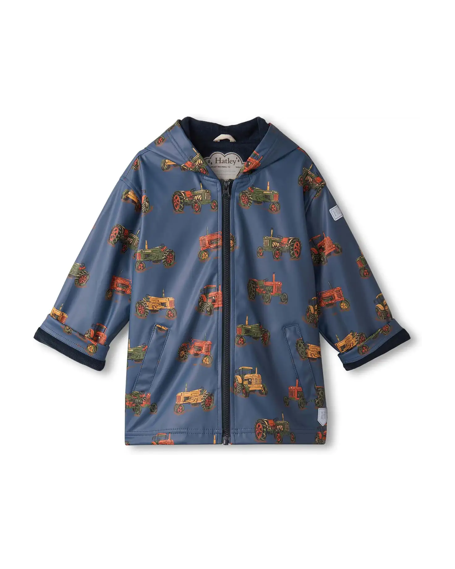 - Keep them adventure-ready, rain or shine, in the Hatley® Kids Rain Jacket. Featuring an attached hood with a front zipper closure, long sleeves, front hand pockets, allover print, an inside hanger loop, and a regular fit.