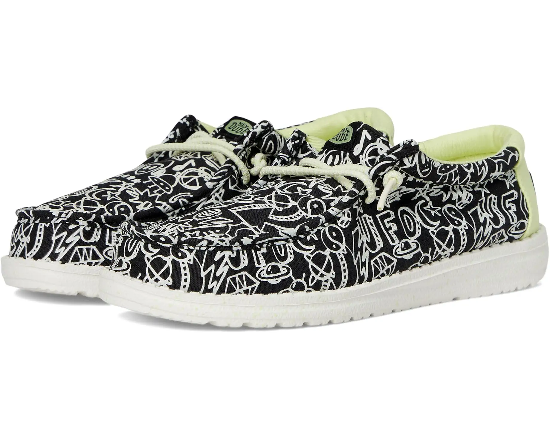 - The Hey Dude® Kids Wally Space Glow shoe is built for adventure with a breathable textile-canvas upper that keeps things light and breezy. Easy-on elastic laces make slipping in and heading out a breeze, while the cushy ethylene vinyl acetate outsole and removable insole deliver all-day comfort for nonstop play.