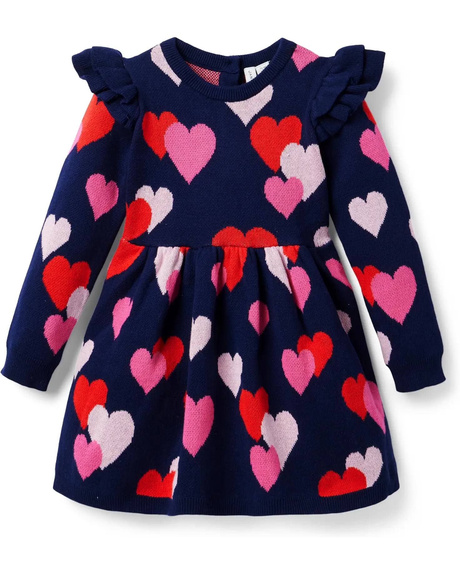 - Find a forever kind of love for your kid by wearing Janie and Jack® Sweater Intarsia Dress. The dress features a crew neck, ruffle shoulders, and long sleeves. It has knee-length skirt with allover heart prints that give more playful appearance.