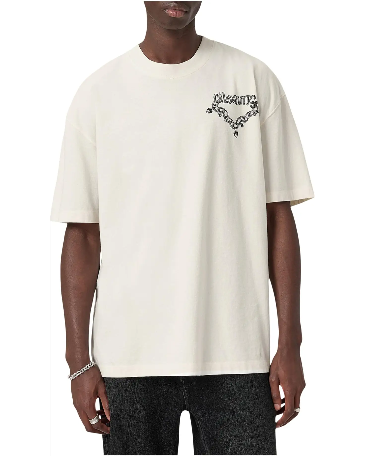 - Give your casual style game a chic update wearing the AllSaints™ Drip Short Sleeve Crew Tee. The pull-on style tee comes with a classic crew neckline, short sleeves, and a straight hemline. The cool graphic print on the left chest & back yoke features All Saints™ branding with funky chain detailing all-around.