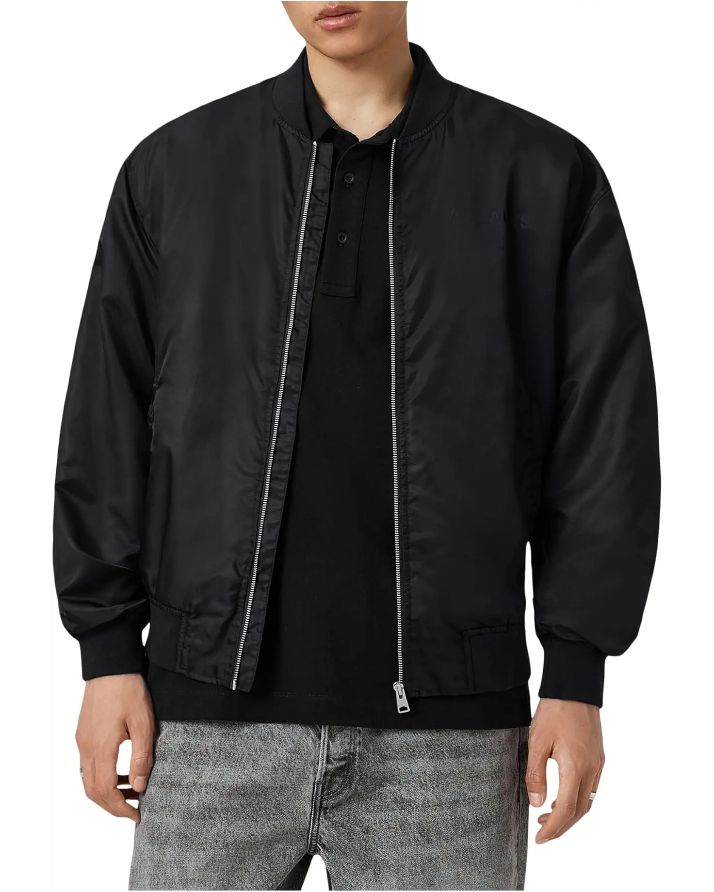 • Sleek and smart, the AllSaints™ Future Bomber. This statement-making jacket features a zippered front closure for easy wear and long sleeves for that essential coverage. The minimalist silhouette is punctuated by discreet hand pockets for functionality without sacrificing style. Turn heads with bold AllSaints branding across the back, a signature touch that sets this piece apart from the basics.