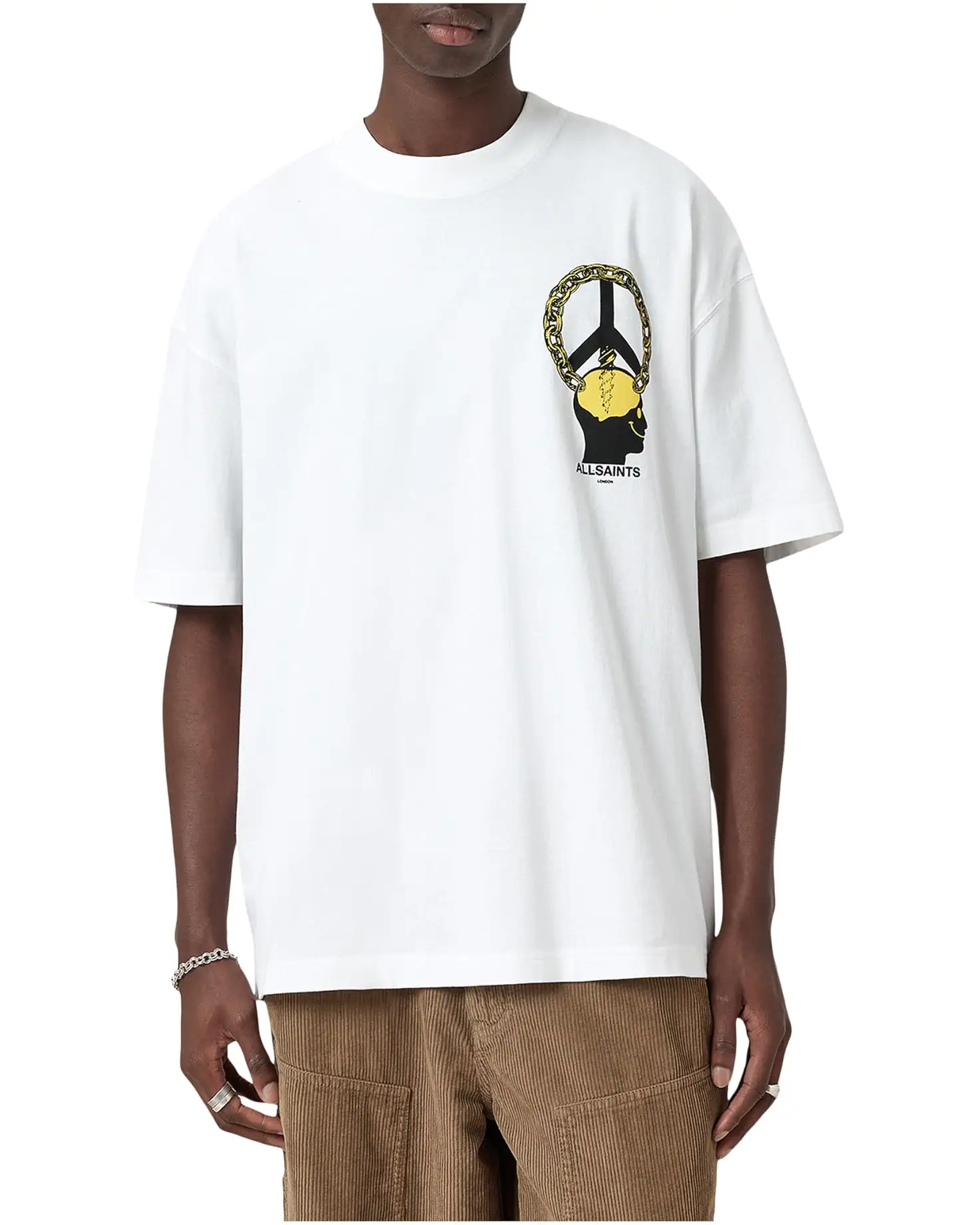 - The AllSaints™ Screwed Short Sleeve Crew is a statement tee that blends minimalist design with bold graphic edge. It features a crew neckline, short sleeves, and a relaxed fit with a straight-cut silhouette. The standout detail is the graphic print across the chest and back, giving it a modern, streetwear-inspired vibe.