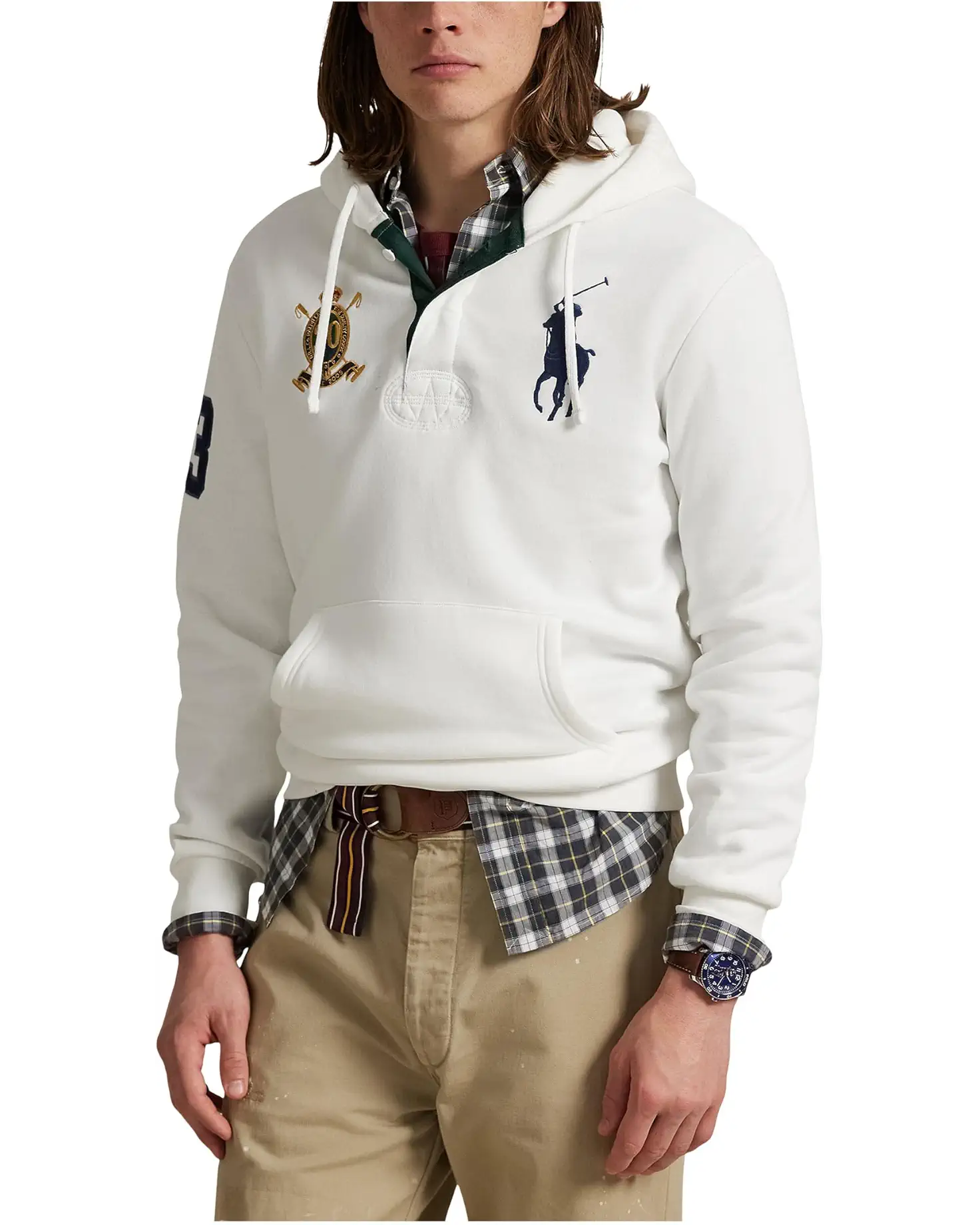 - The Polo Ralph Lauren® Big Pony 20th Anniversary Crest Hoodie features an equestrian-inspired, signature "20" crest with a "Since 2005" banner, celebrating 20 years of Ralph Lauren's iconic Big Pony. Made from a cotton-blend fleece fabric that keeps you cozy and comfortable, this pullover hoodie is styled with long sleeves, rib-knit cuffs, and a rib-knit hem. Its attached hood has a two-button rugby placket with rubber-finished buttons. Designed with a twill "3" patch on the right sleeve and a signature embroidered Big Pony on the left chest, this hooded sweater is a perfect choice to get ready for casual outings or sports events.