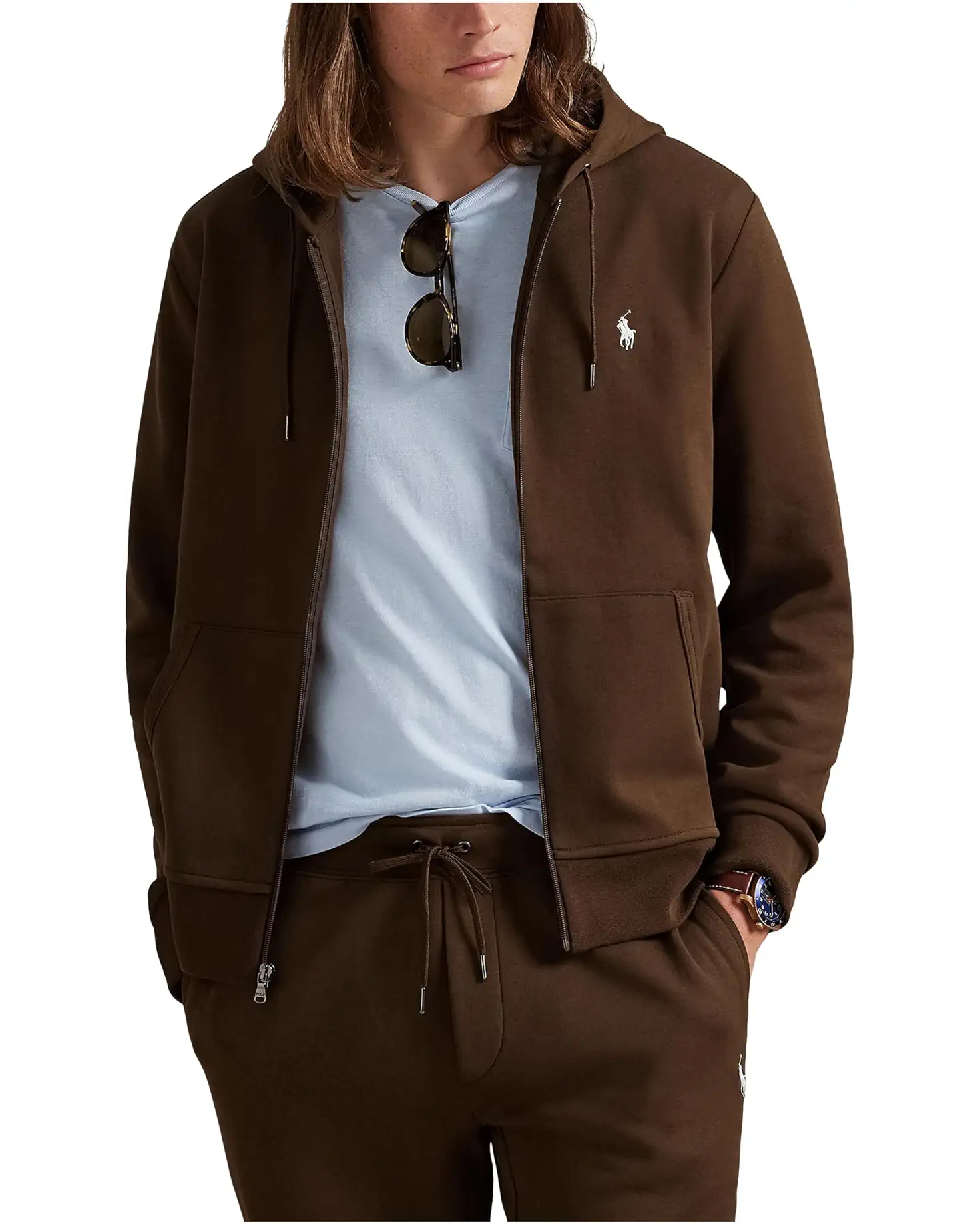 - Slay a stylish and comfortable look by wearing the Polo Ralph Lauren® Double-Knit Full-Zip Hoodie. The regular-fit hoodie has an adjustable drawstring at the hood, long sleeves with ribbed cuffs, full front zipper closure, and a split kangaroo pocket. It boasts a signature embroidered pony at the left chest to aesthetics.