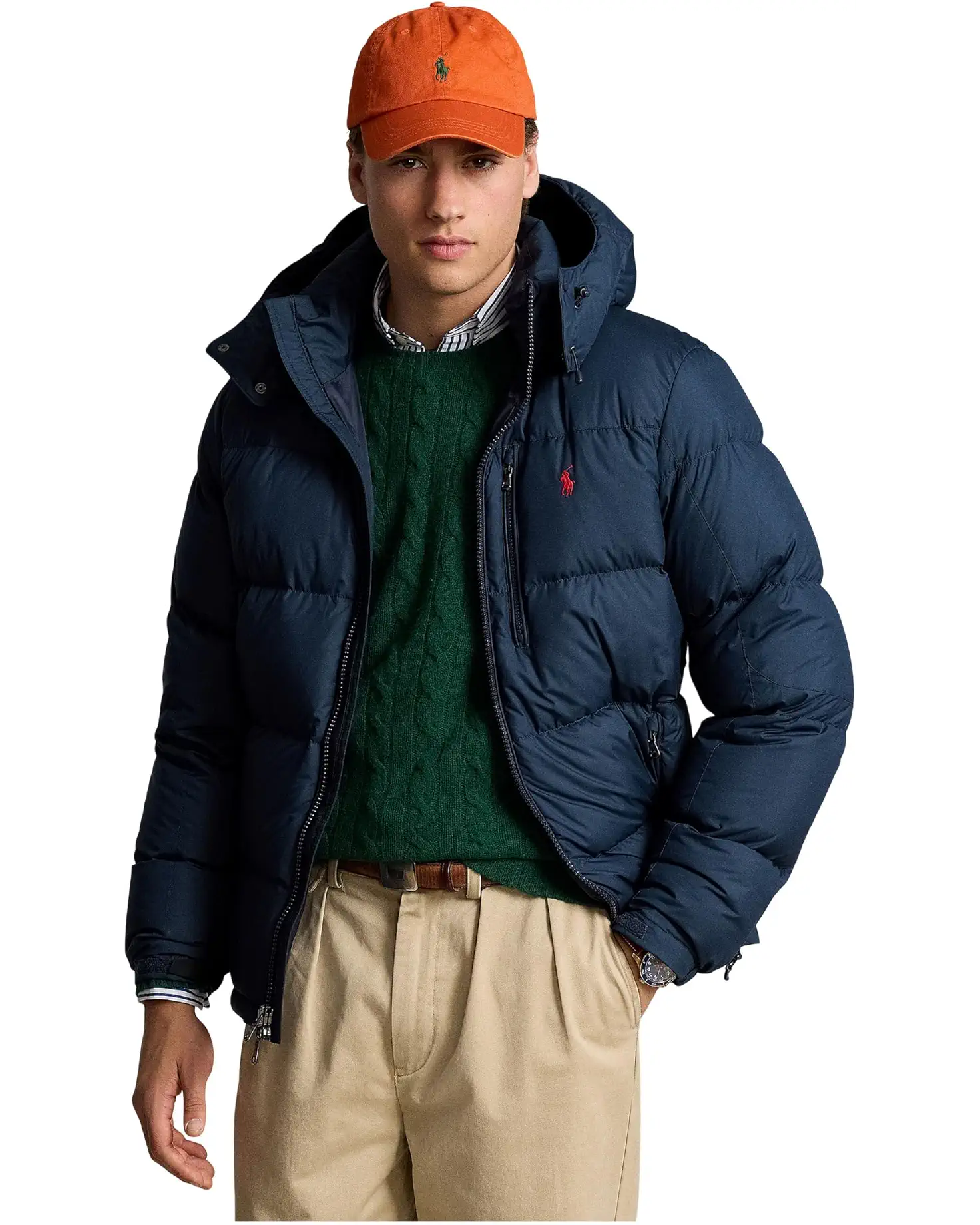 - The Polo Ralph Lauren® Gorham Glossed Down Jacket is crafted from water-repellent fabric and filled with 650-fill-power down for insulation. On the left chest, it is embroidered with the iconic signature Polo Pony. The two-way zippered front closure of the jacket has a storm guard and a flap at the top that prevents chafing. Fully lined and filled, this zip-up jacket is styled with long sleeves, elasticized cuffs, a mock neckline, a zip-off ripstop drawstring hood with snapped closures, and a drawstring hem.