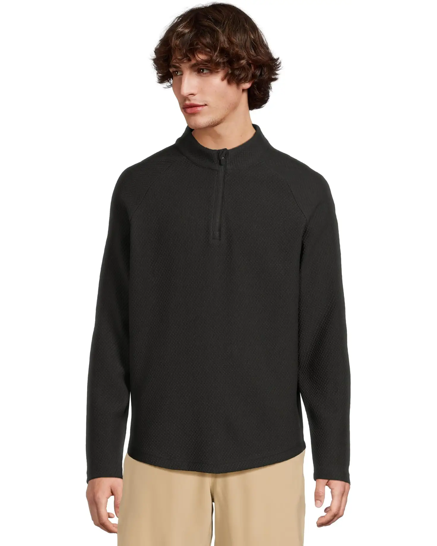 • Mock neck with quarter-zip closure.