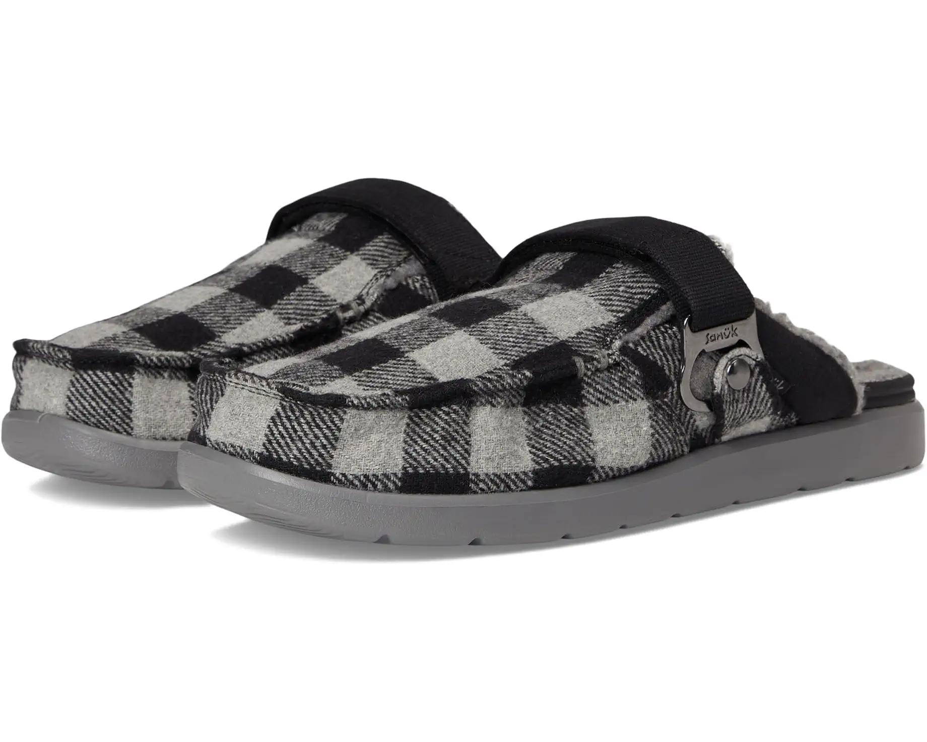 - The Sanuk® Happy Hour Lite Buffalo Chill loafers are faux-fur-lined, relaxed-fit mules that keep your feet comfortable and warm. Their upper is made from a soft polyester blend, while the adjustable webbing closure strap features a removable custom bottle opener. These plaid mules are made of an EVA insole heel pad for all-day comfort with or without socks. Easy to slip on and off, these patterned mules are a perfect choice for lounging at home.