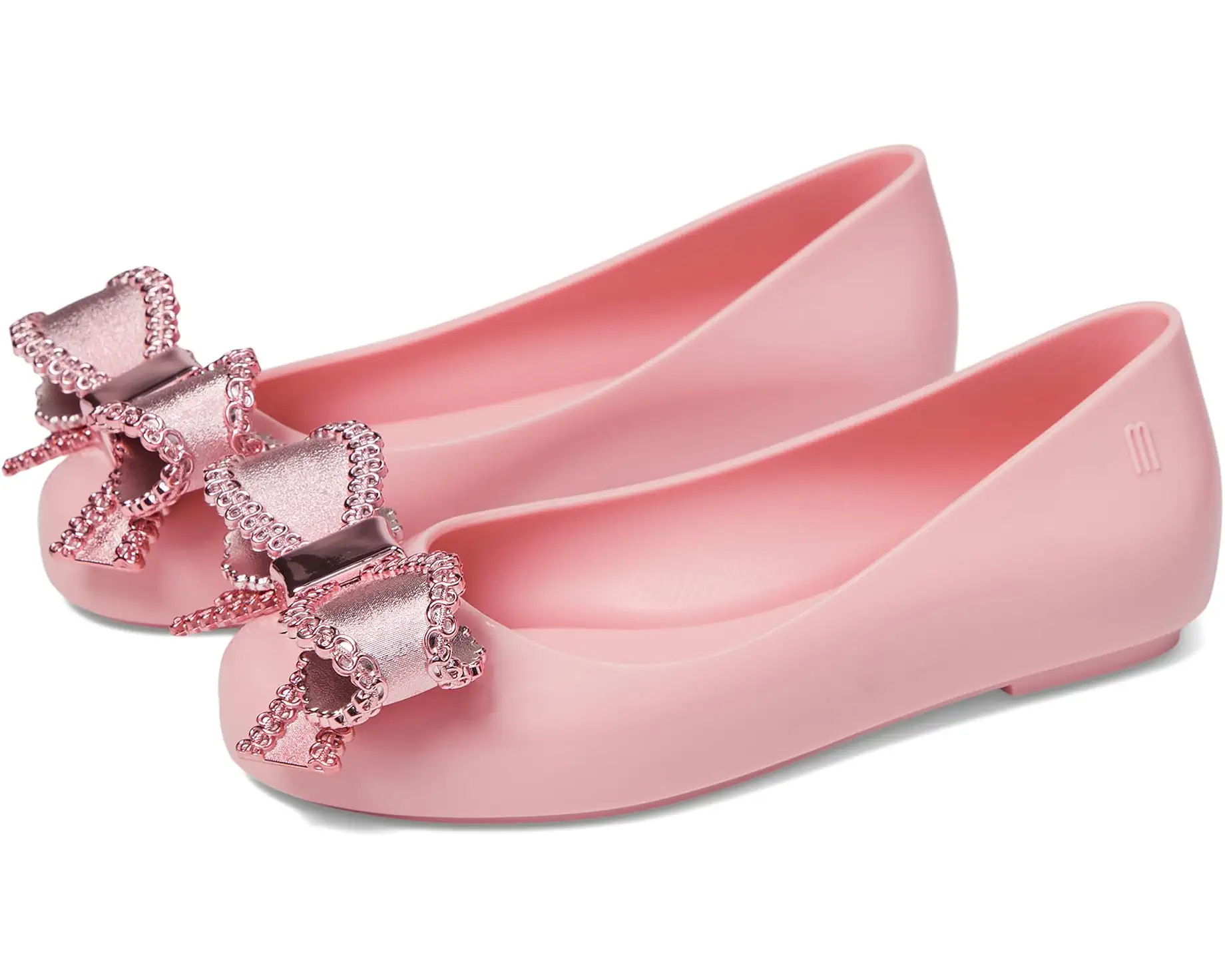 • Get that truly cute look for your little one with Mini Melissa® Sweet Love INF. The flats feature round toe design, shimmery with stud work bow detailing on the toe, and slip-on construction.