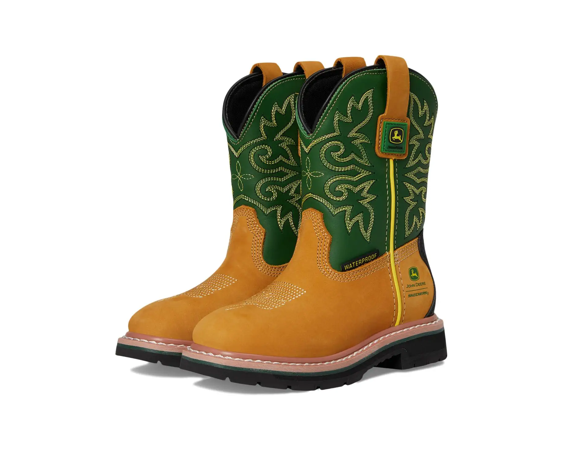 • Get your kid ready for outdoor adventures wearing the SKECHERS® KIDS X John Deere-rowood - Boulder Valley 407050L boots. These waterproof work boots feature a durable Goodyear welt construction, leather upper with embroidered detail and a John Deere tractor charm, and a cushioned Skechers Air-Cooled Memory Foam® insole. Their seam-sealed waterproof design keeps your kid's feet dry, while the cotton lining provides added comfort. For youngsters dreaming of driving a tractor someday, these pull-on boots have arrived. Your little one can 'work' alongside you in total comfort thanks to these fun mini-you styles.
