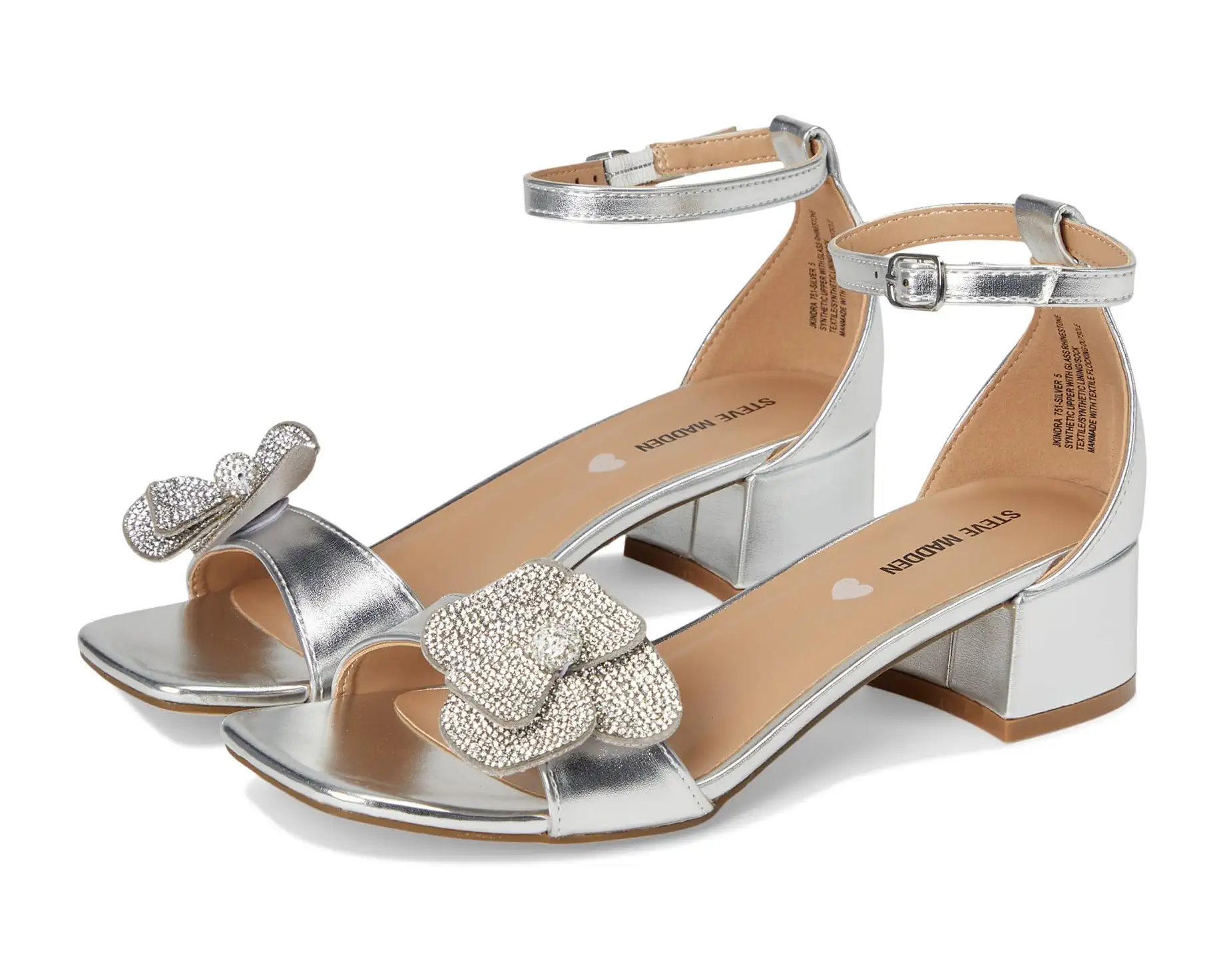 - Finish off your little fashionista's formal looks with the Steve Madden® Kids Kindra sandals. These dress sandals feature a polished metallic rubber upper, complete with solid block heels, a dainty ankle strap design, and a rhinestone-covered floral accent. They are made of a rubber insole and a synthetic rubber lining. Style up your kid's outfits with these heeled sandals.