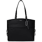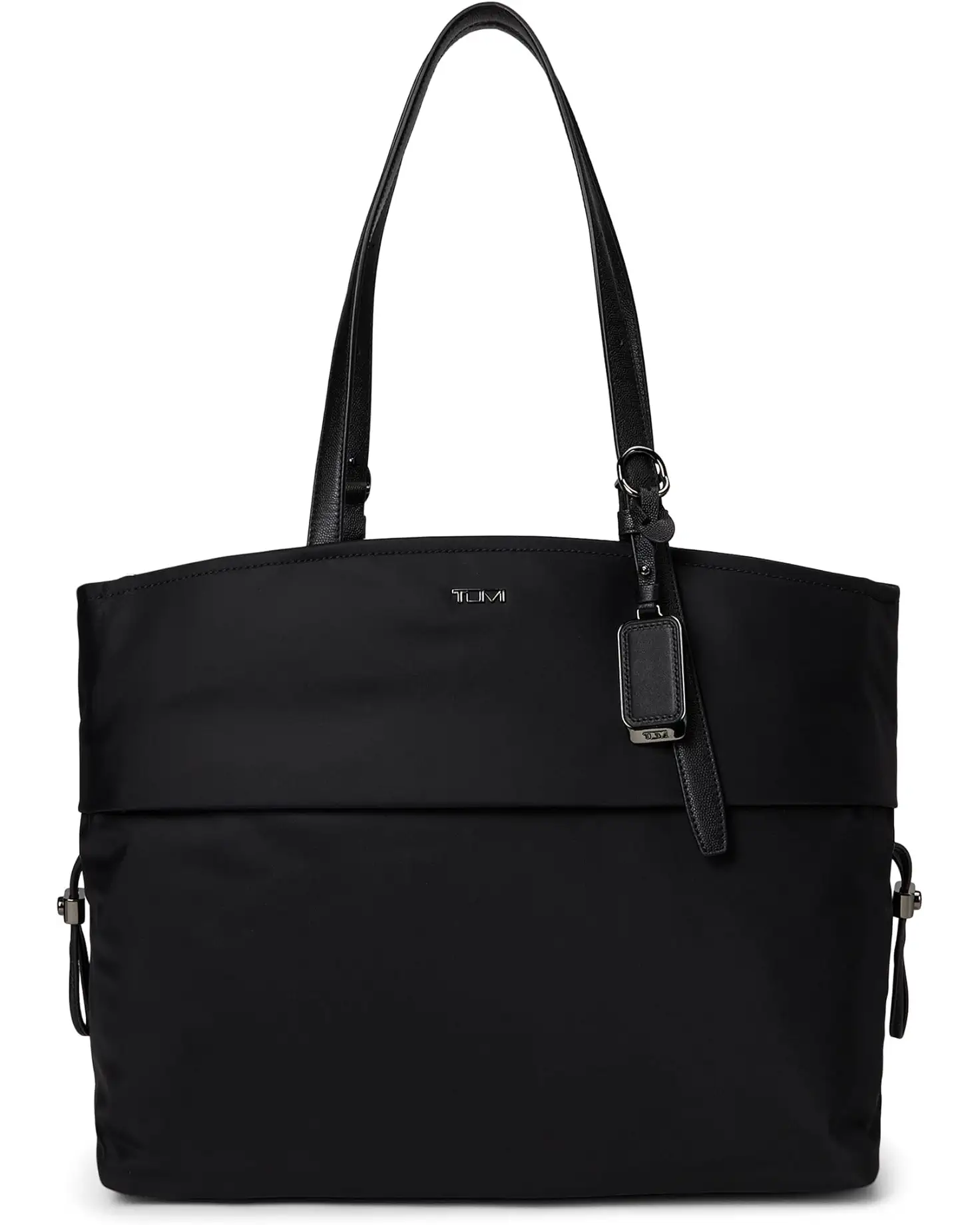 • Beyond the basic carryall, Tumi® Cam Large Tote. Crafted from durable nylon with luxe leather accents, this tote is your ultimate companion for work, travel, or city adventures. The zippered main compartment opens to reveal a padded laptop pocket, dual media pockets, key leash, leather pen loop, leather card pocket, and a secure zippered pocket, keeping essentials organized and within reach. Quick-access phone pockets with hidden magnetic snaps, side-adjustable leather drawstrings, and leather feet add thoughtful convenience and sophistication. Transform travel with the back open pocket that unzips into an Add-a-Bag sleeve, while the monogrammable detachable leather charm adds a personalized touch. Adjustable leather shoulder straps ensure comfort all day, and TUMI Tracer technology keeps your tote connected for life. With hidden compartments, D-rings, and sleek zipper entries, the Tumi Cam Tote isn't just a bag; it's a statement.