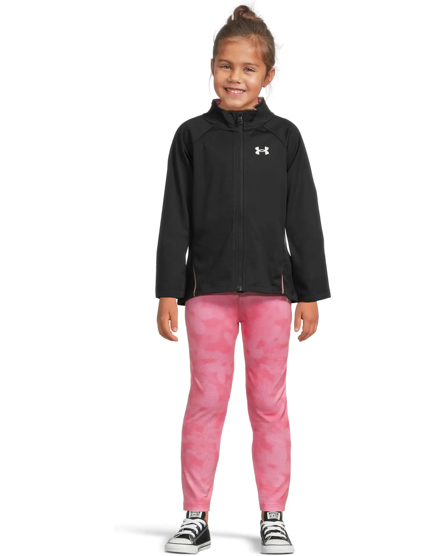 - Engineered for her hustle: The Under Armour® Kids Rival Flutter Track Set blends performance and style for unstoppable energy and all-day comfort. The zippered front jacket features a sleek front closure, long sleeves, and a playful back-side peplum, combining sporty vibes with a fun, feminine flair. Paired with stretch leggings in a mid-rise, ankle-length fit, this set offers the perfect blend of flexibility and support for running, jumping, or lounging. Crafted from soft, brushed-back tricot, it delivers lightweight warmth and cozy comfort, while the fitted silhouette ensures she looks as good as she feels. Pull-on ease and durable construction make dressing effortless, whether it's for school, practice, or weekend adventures.
