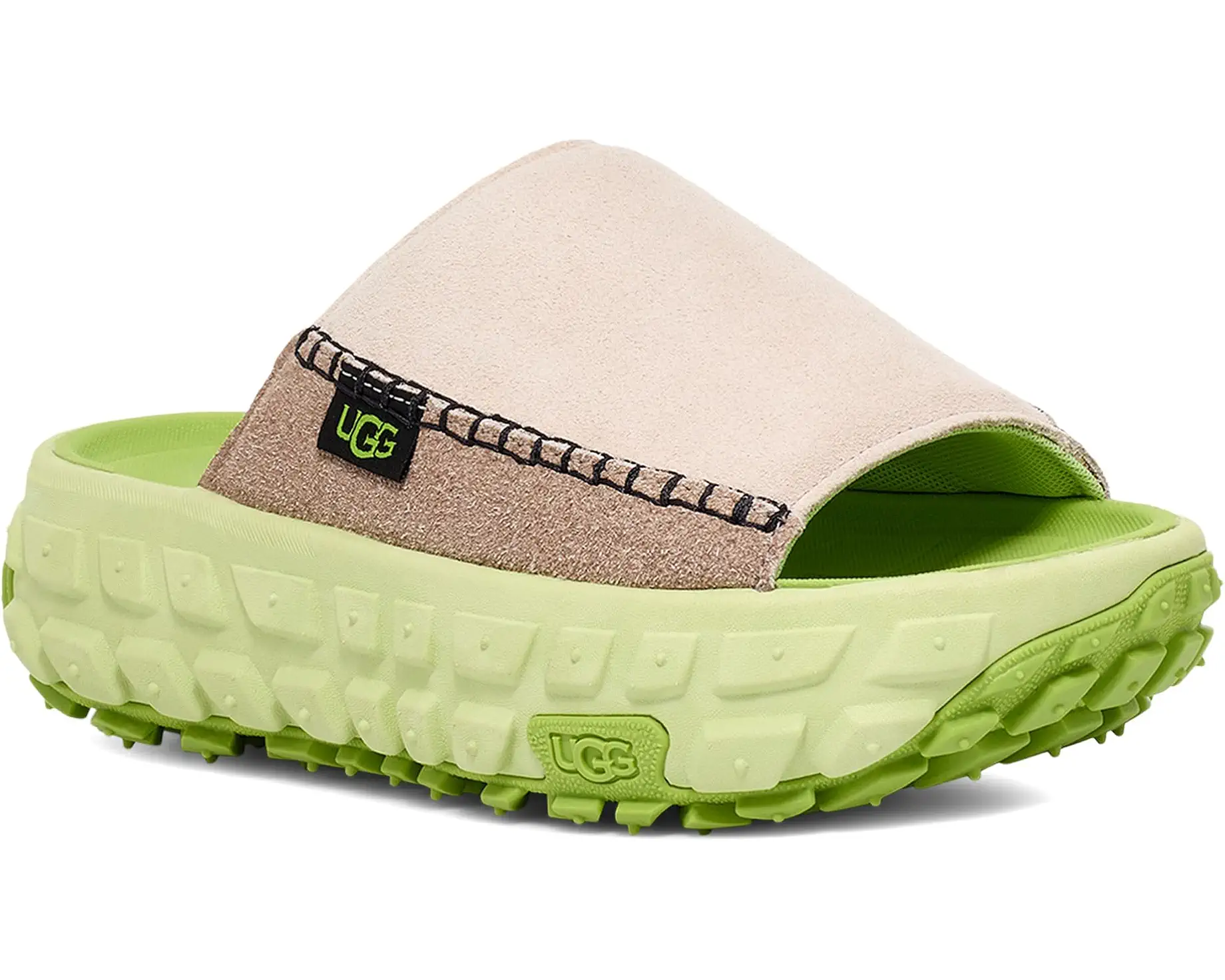 • Dazzle your feet with comfort by wearing the UGG® Venture Daze Slide. The slip-on style sandals have an open round-toe design and an elaborate padded cow suede upper with a brand logo tag on the side. The sandals have a textile lining made from recycled polyester fibers, and sugarcane EVA footbed for added comfort.