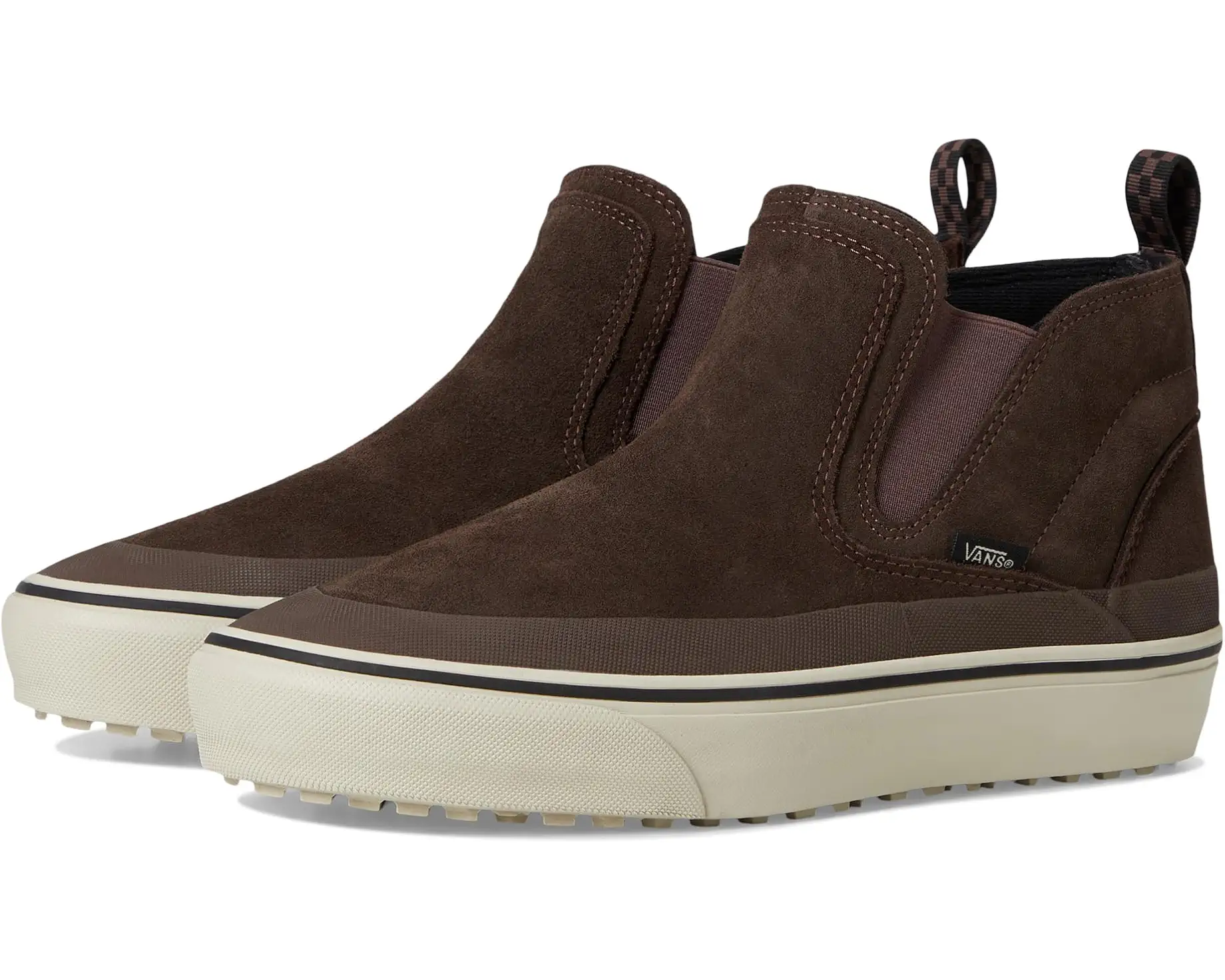 • The Vans™ Mte™ Mid-Slip Insulated is a slip-on built for comfort, warmth, and all-weather protection with a rugged Chelsea boot-inspired silhouette. The upper combines leather, suede, and textile materials, treated with a durable water-repellent (DWR) coating to shed light moisture. Inside, a 100-gram insulation package helps retain warmth, while the UltraCush™ drop-in footbed provides cushioned support for all-day wear.