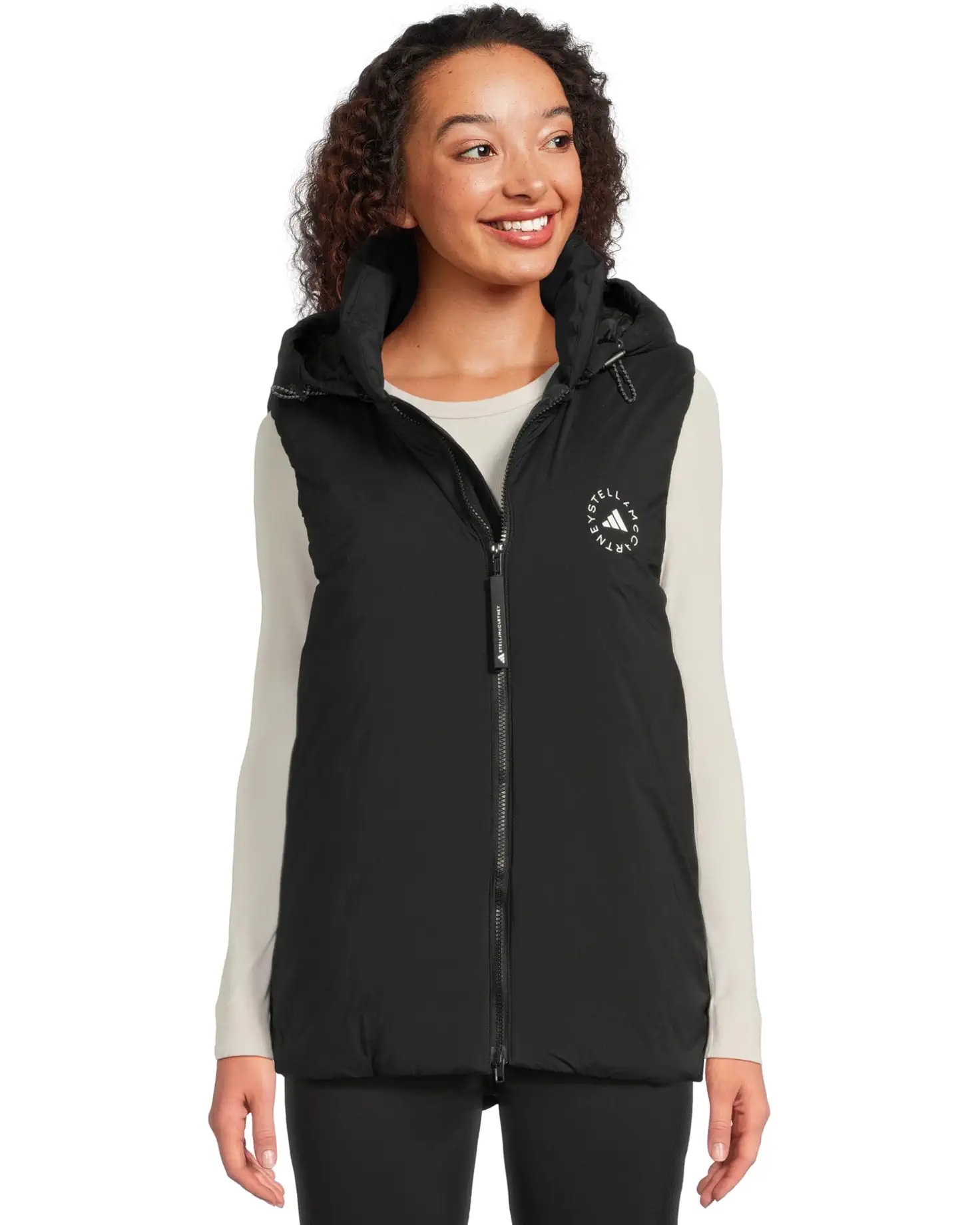 - Power dressing meets sporty chic donning the adidas® by Stella McCartney™ Padded Vest JW2038. Crafted in a regular fit, this vest blends sleek design with functional ease, making it your go-to piece for crisp mornings, transitional seasons, or layering over activewear. The zippered front closure ensures effortless wear, while the detachable hooded neck offers versatile styling; wear it on for cozy coverage or off for a streamlined look. Its sleeveless design gives you the freedom to move with ease, whether you're training, traveling, or simply out and about. Built with padded warmth and adjustable details, this vest delivers comfort that adapts to your lifestyle while elevating your wardrobe with modern flair.