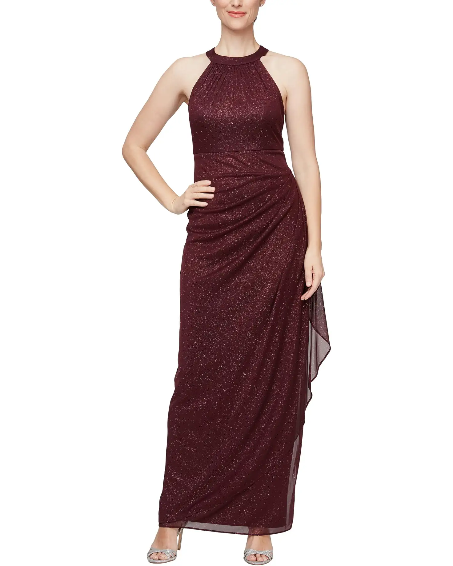 - Get ready to make a statement wearing the Alex Evenings™ Long Sleeveless Halter Neck Dress. A versatile apparel which can be worn at all kinds of events, this dress speaks of elegance and comfort. A slight ruffle around the waist provides volume and adds to the curvy silhouette. Wear this glittery dress to your next casual or formal event and look gorgeous.