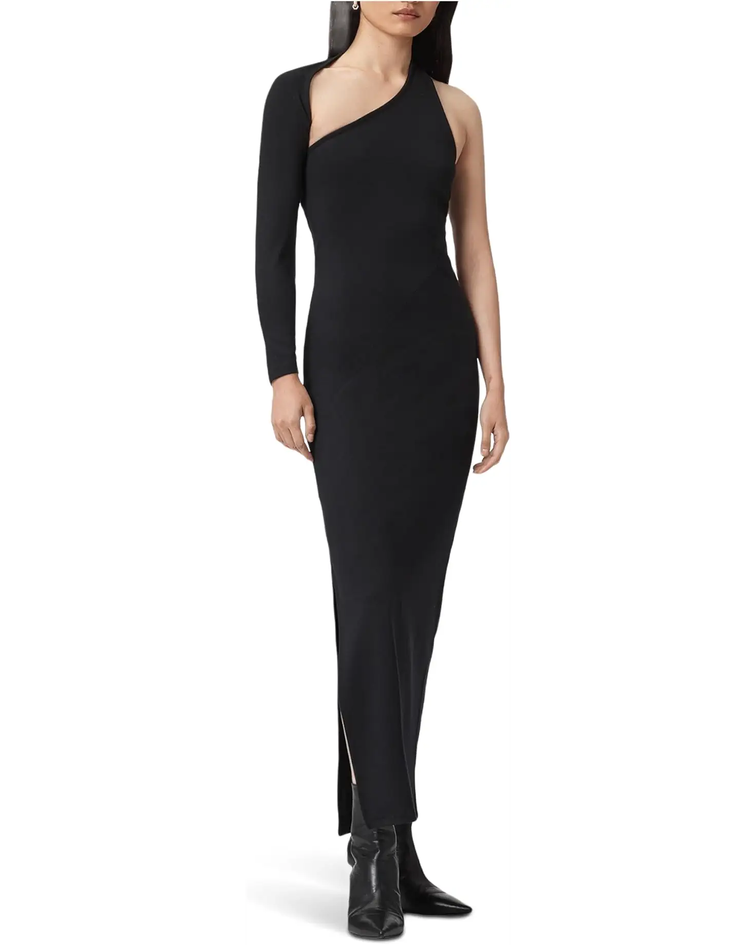 - Own the night with daring elegance in the AllSaints™ Ari Dress, where bold meets timeless chic. This ankle-length stunner is crafted in a sleek bodycon silhouette that flatters every curve, making it your go-to statement piece for evenings that demand attention. The striking crisscross neck adds modern edge, while the single long sleeve creates an asymmetric balance of allure and sophistication. A daring side slit on the hem ensures effortless movement and a hint of drama with every step. Designed with a convenient pull-on style, the Ari Dress keeps things sleek and simple without compromising on high-impact glamor.