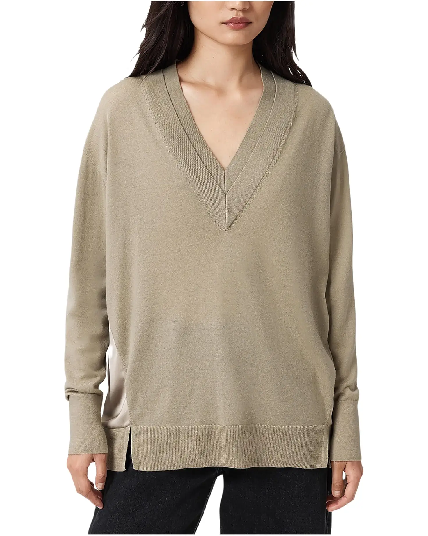 • Experience cozy and comfortable vibes as you head out wearing the AllSaints™ Bern Panel V-neck Sweater. The pull-on style sweater features a V-neckline, long sleeves with thumbholes, and a straight ribbed hem with side slits.