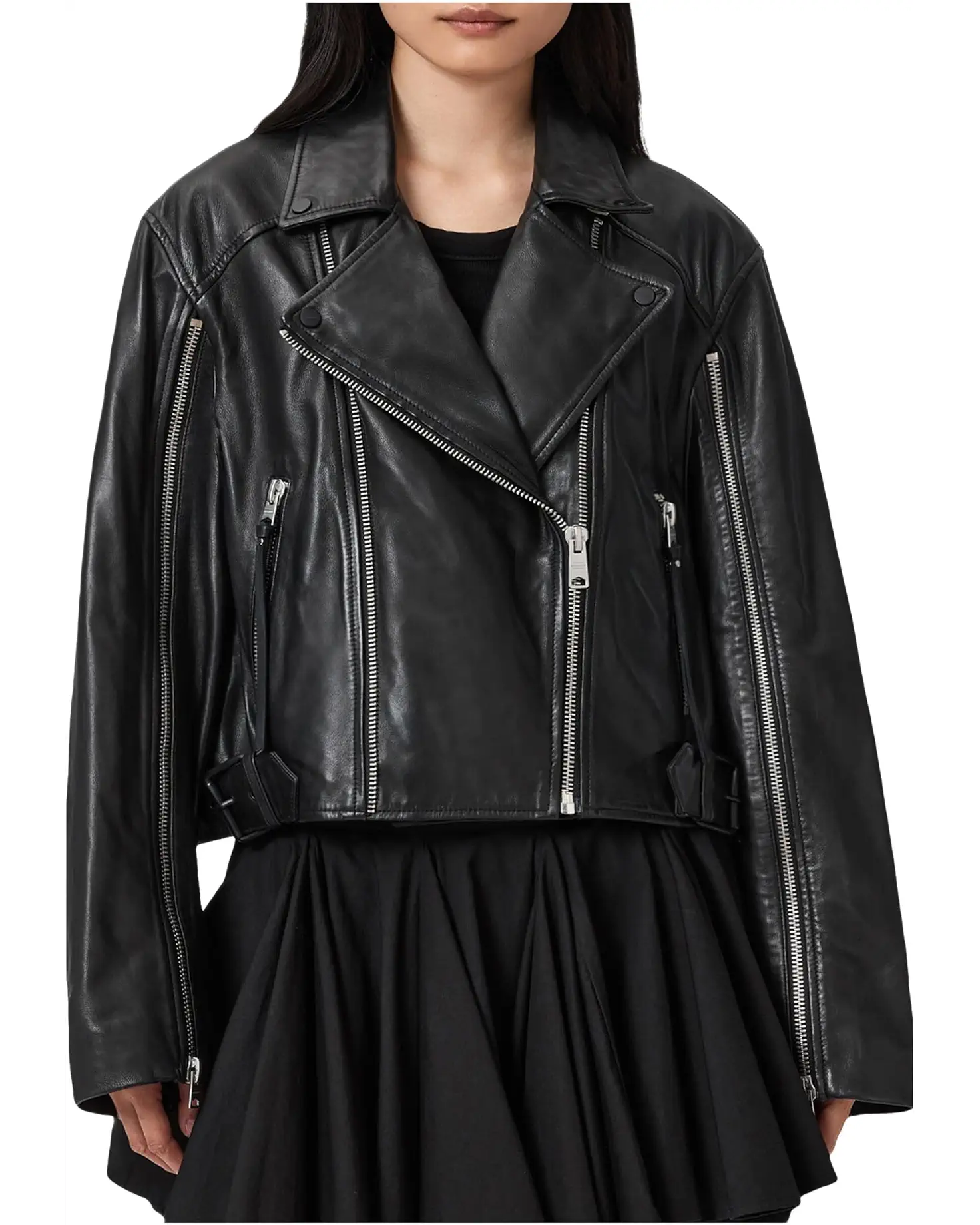 • Own the edge styling AllSaints™ Masone Biker. Cut in a regular fit for effortless layering, this jacket features a structured collared neck and long sleeves with edgy zippered cuffs that speak to your inner renegade. The front zipper closure adds clean lines and a secure fit, while zippered hand pockets fuse attitude with utility. Whether you're riding into the weekend or rocking it downtown, the Masone Biker gives off that unapologetic cool with every wear. Crafted for those who live loud and look sharp, it's your go-to for bold city vibes and timeless flair.