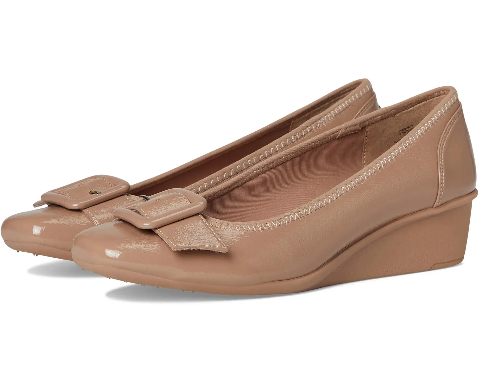 - The Anne Klein® Wyatt is a refined staple that features a squared toe and a suede upper, elevated by a patent-texture heel counter. The padded polyurethane insole ensures all-day wearability, while the rubber traction outsole provides stability with every step. Set on a sleek wedge heel, this versatile pump transitions effortlessly from office to evening.