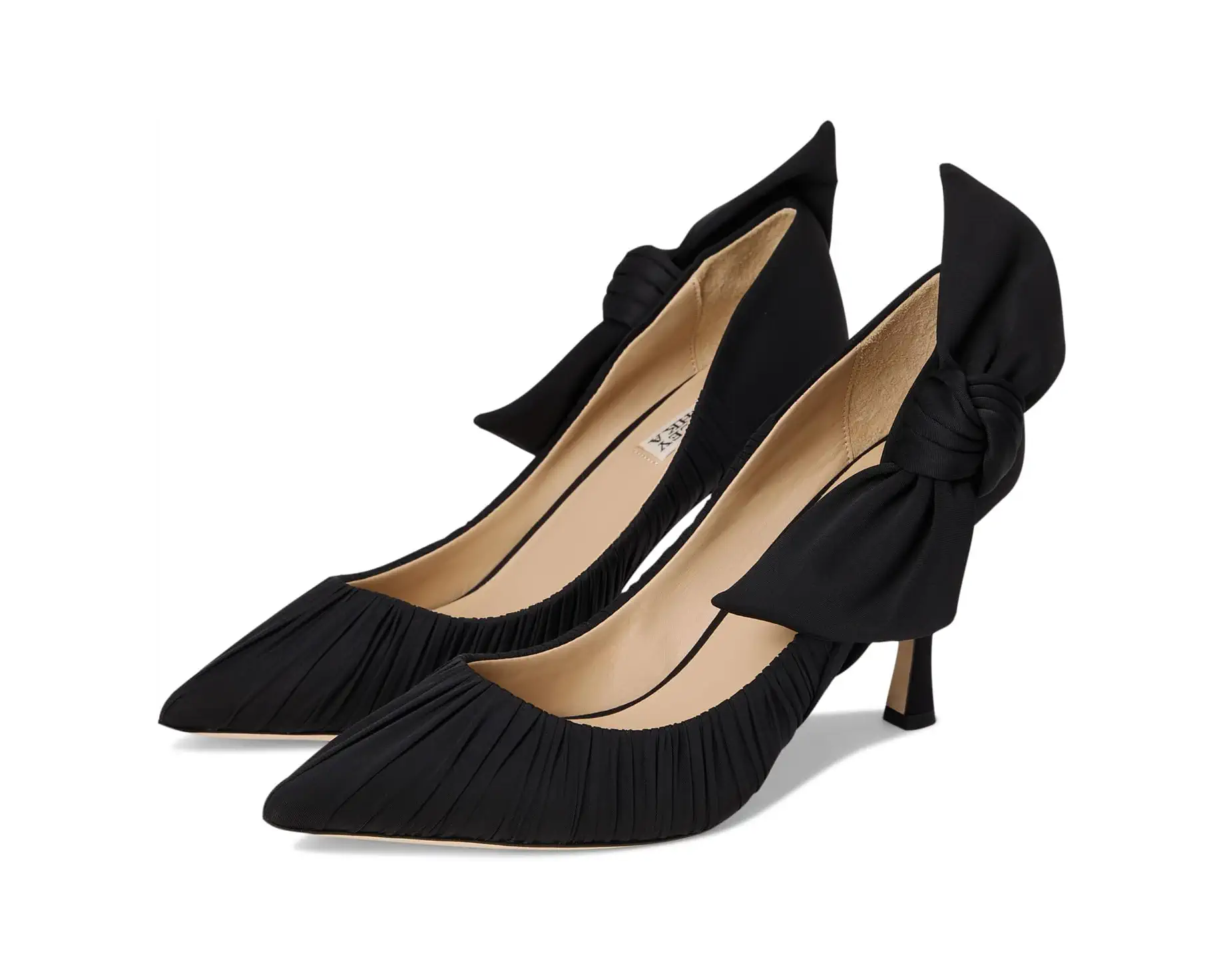 - Make a statement donning the Badgley Mischka® Vanesa heels! These gorgeous pumps are adorned with an oversized bow that will instantly elevate your look. Crafted from beautiful silk upper and featuring breathable leather lining and insole, these heels are both stylish and comfortable. The pointed toes add a touch of sophistication to these must-have shoes that are perfect for any special occasion.