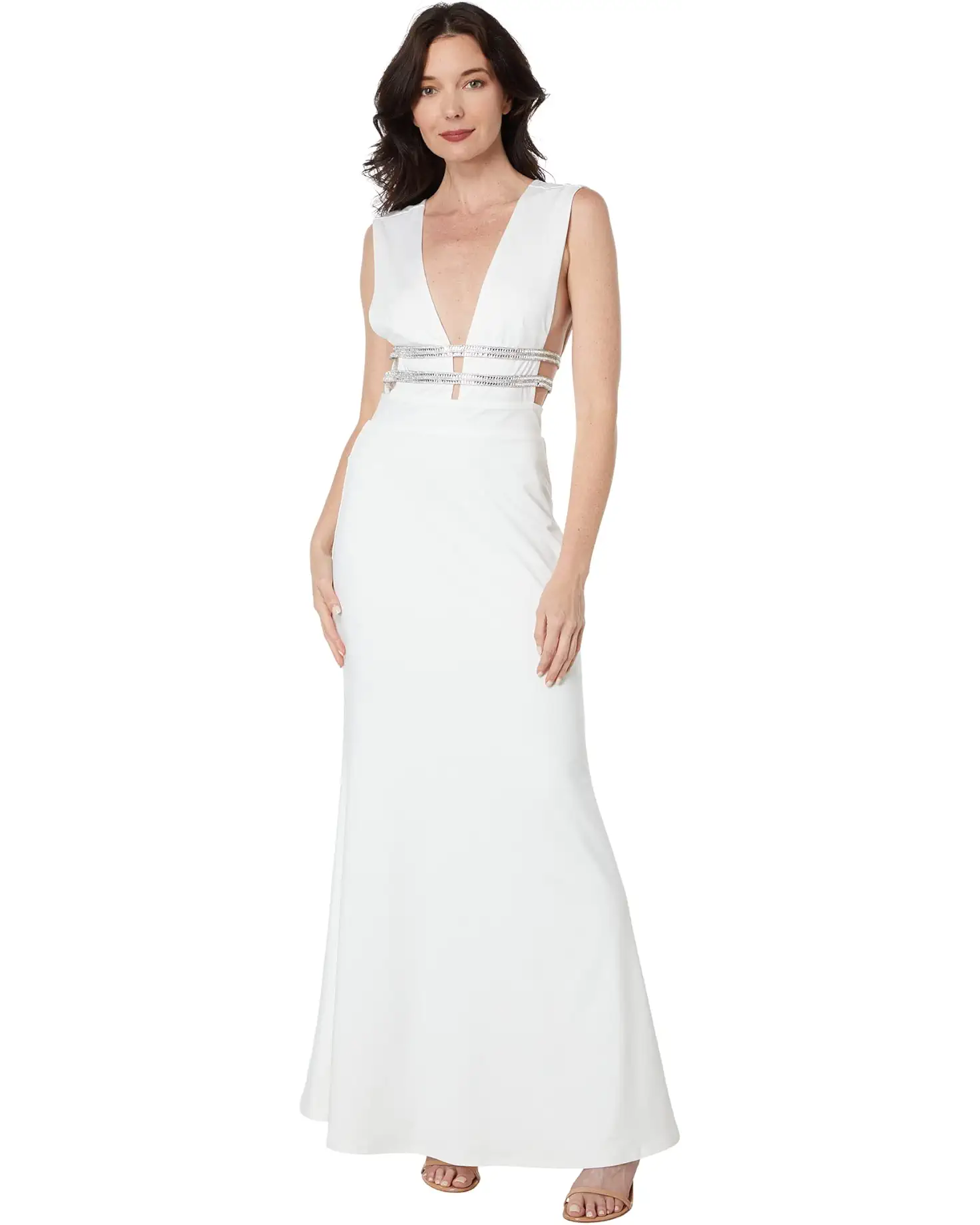 • Stand out and shine at any event in the bebe® Illusion Cutout Sparkle Gown.