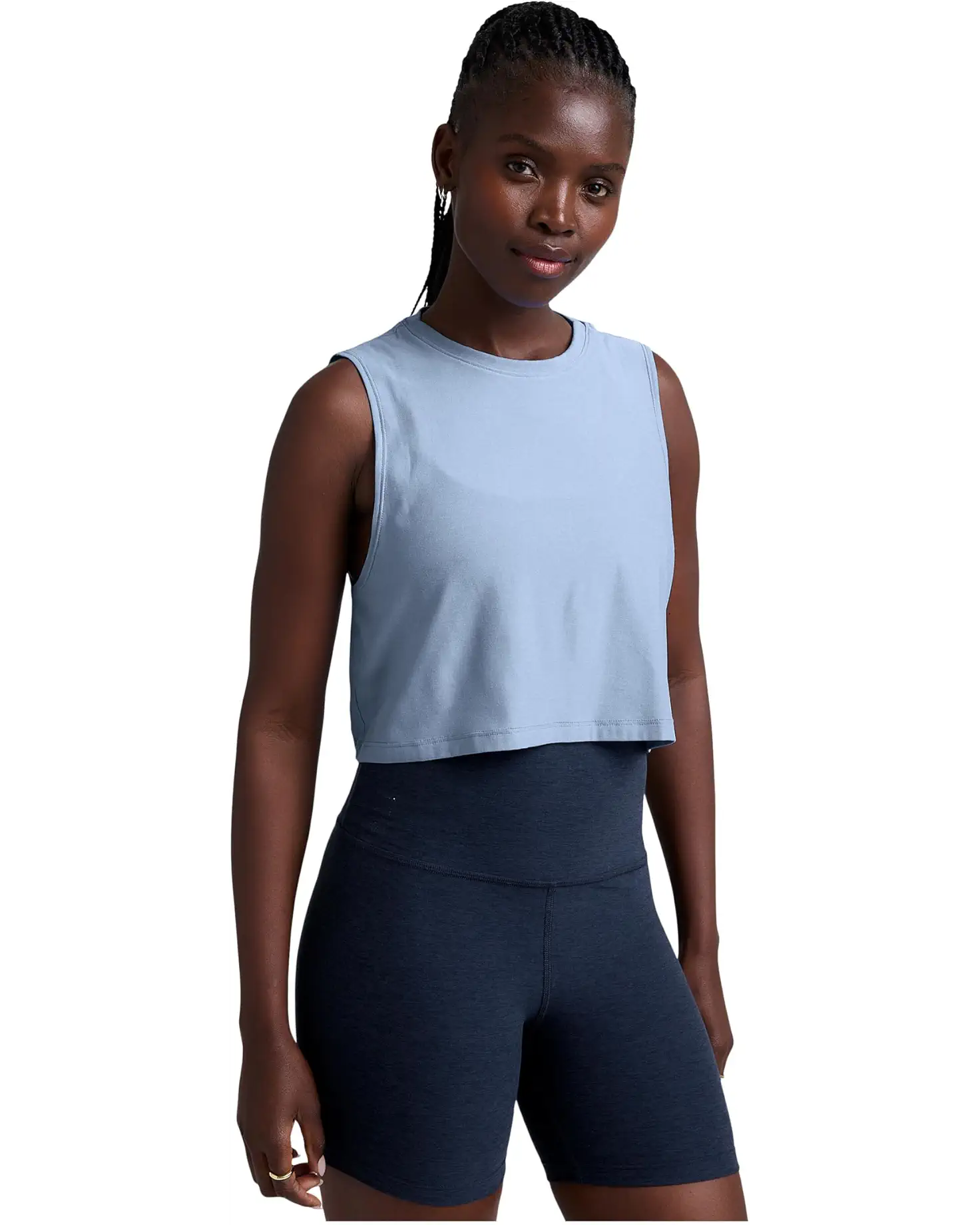 - The standby style you know and love, the Beyond Yoga® Featherweight Minimal Cropped Tank, is updated to be even more polished with new ribbed trim details. Classically minded with a crew neckline and a straight hem, this sleeveless tank is designed to flatter your build and is made of the lightest fabric you've ever worn. Get this crew tank in every color.