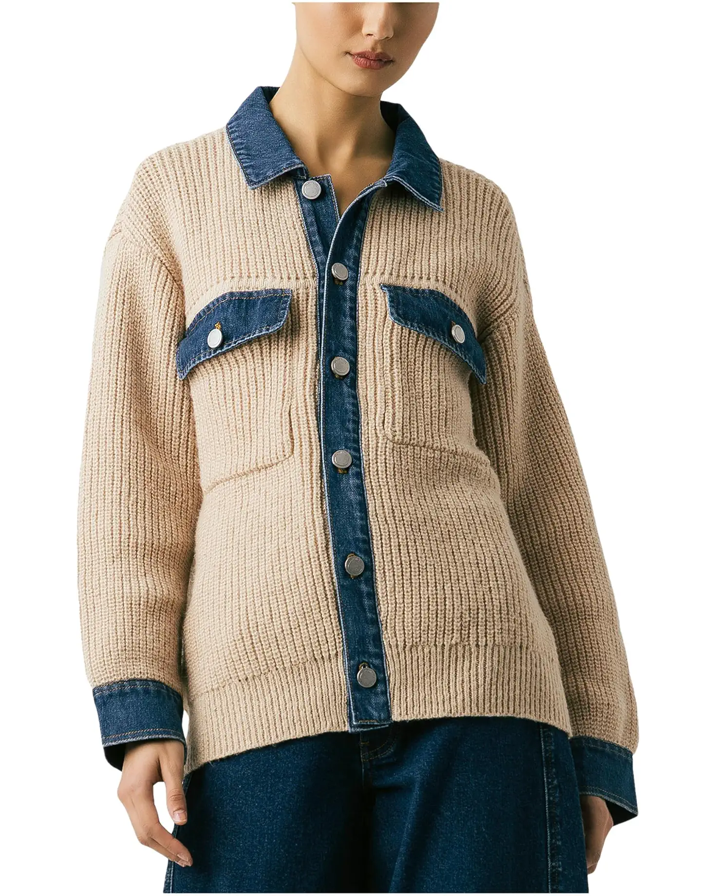 • Stun everyone with your refined taste in fashion wearing Blank NYC™ Playing The Field Sweater Shirt Jacket. The button-front jacket features a collared neck, long sleeves with buttoned cuffs, two flap pockets on the chest, striking denim details, and a ribbed hem.