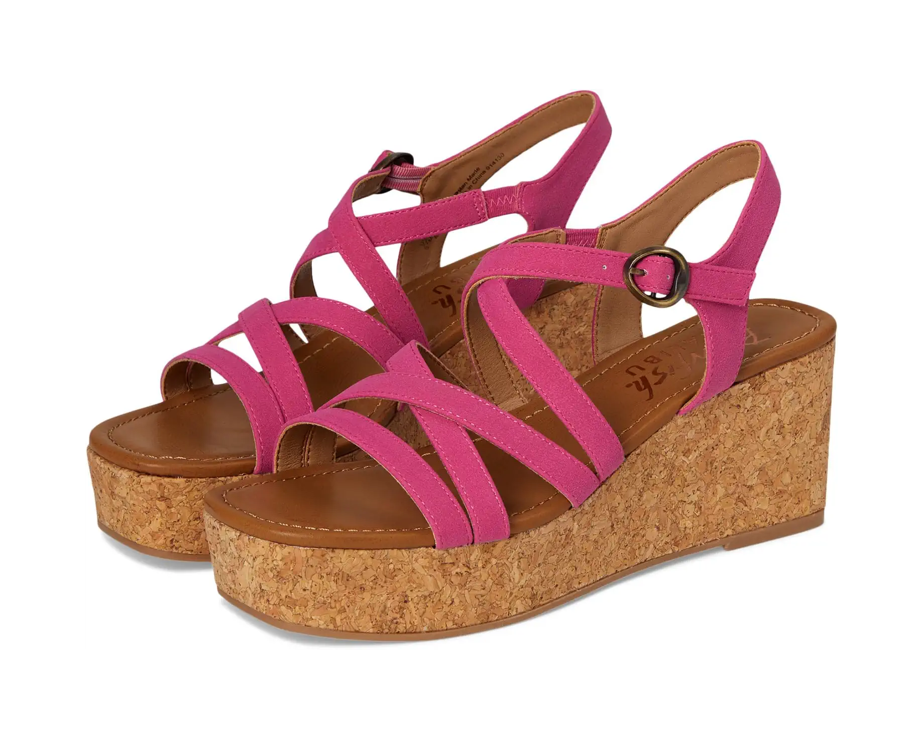 - Step up your style choosing the Aurora Strappy sandal from Blowfish Malibu®, featuring a metal buckle closure and a cork wedge. Crafted from strappy faux-leather upper, polyester lining, foam insole, and synthetic rubber outsole.