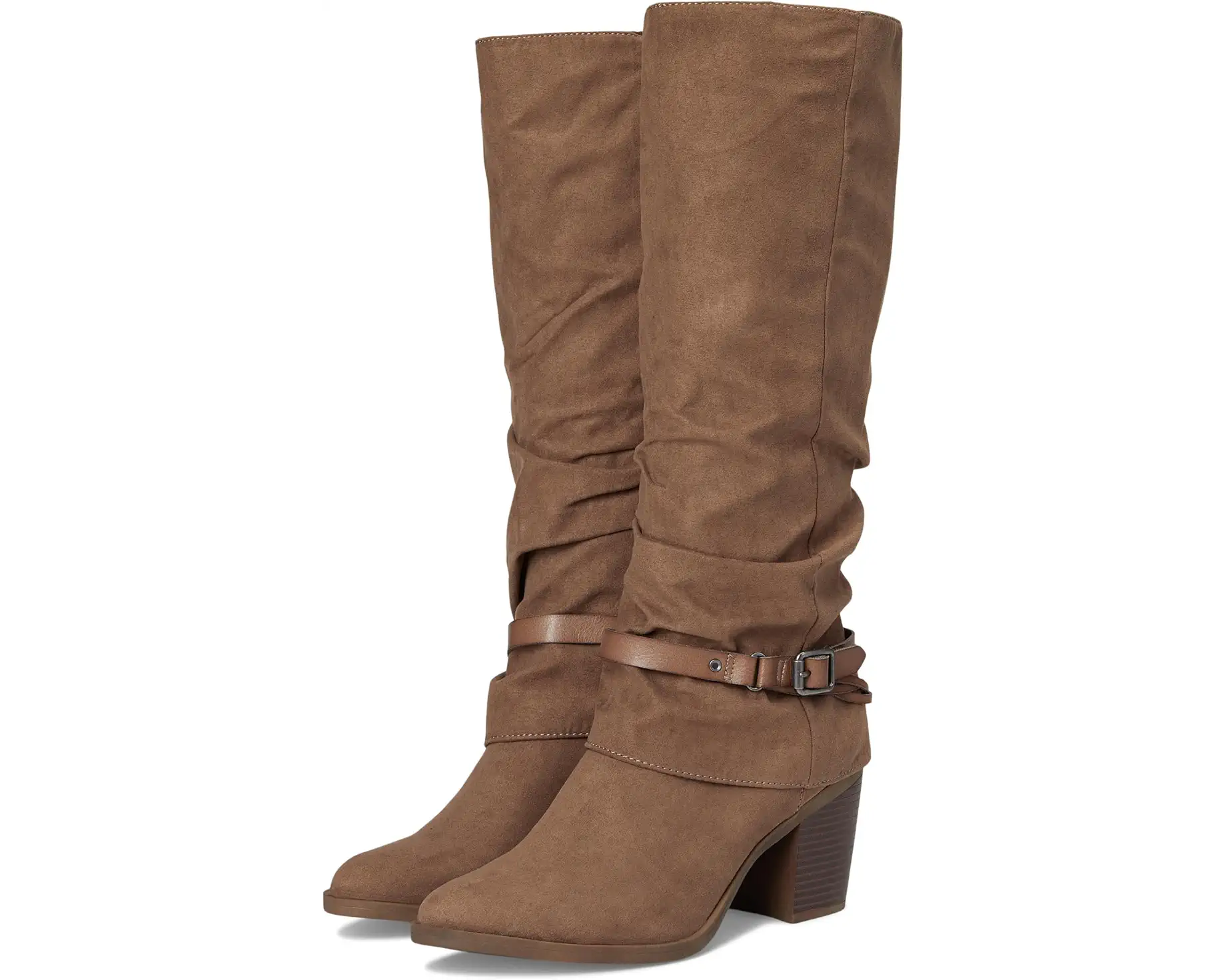 - Discover the perfect boho boot with the Blowfish® Malibu Carey. Designed with slouchy shaft styling, decorative faux leather straps, and buckle accents, it brings texture and movement to any outfit. The inside zipper ensures easy on-and-off wear, while the block heel offers a comfortable lift for all-day strolling. This mid-calf footwear is crafted with a microsuede upper, fabric lining, and foam insole.