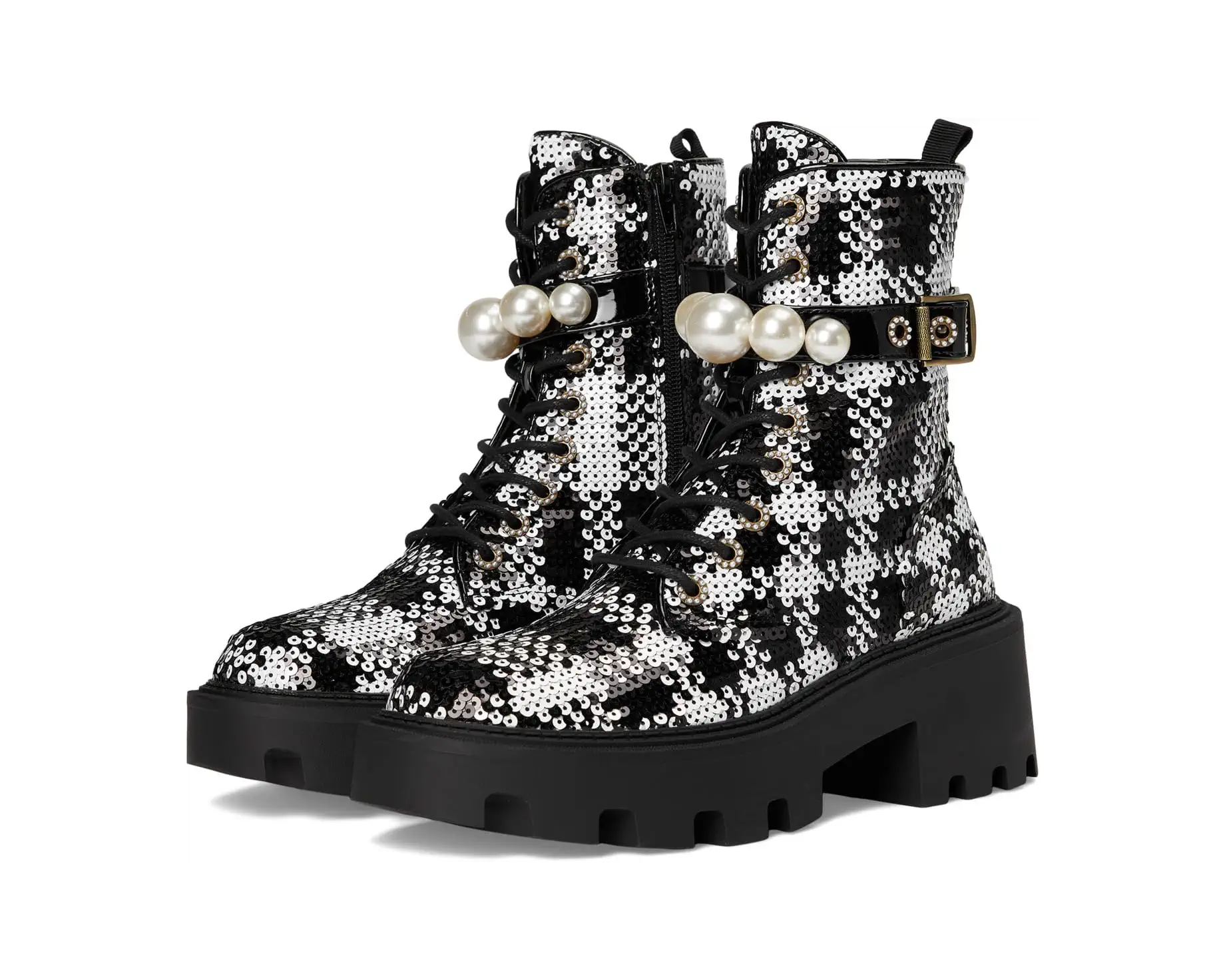 - The Blue™ by Betsey Johnson Jonnie Combat Boot is cool girl approved , with its lug soles and feminine pearl embellishment with side buckle details. The ankle-high boots are crafted with a sequin polyester fabric upper, a polyester lining, and a polyurethane insole. The solid block heel elevates the height and the lace-up design with closure ensures easy on/off.