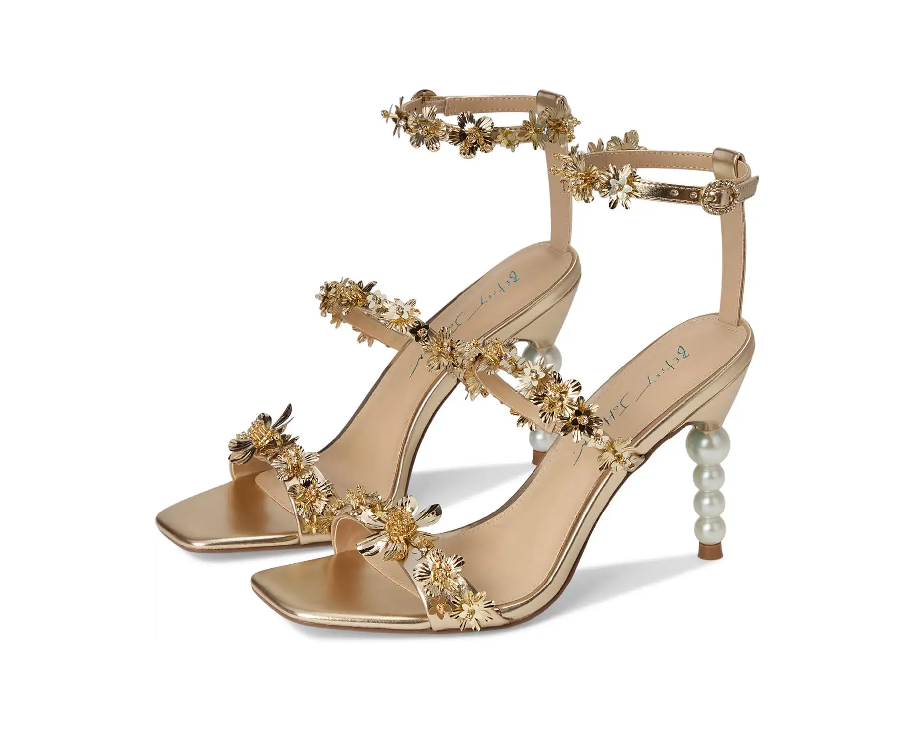 - The Blue™ by Betsey Johnson Lorra Heeled Sandals are both edgy and feminine. They are made of a faux leather insole and lining. The faux leather upper features flower straps and an ankle strap with an adjustable buckle closure. These chic sandals are the perfect touch to your outfit of the night.