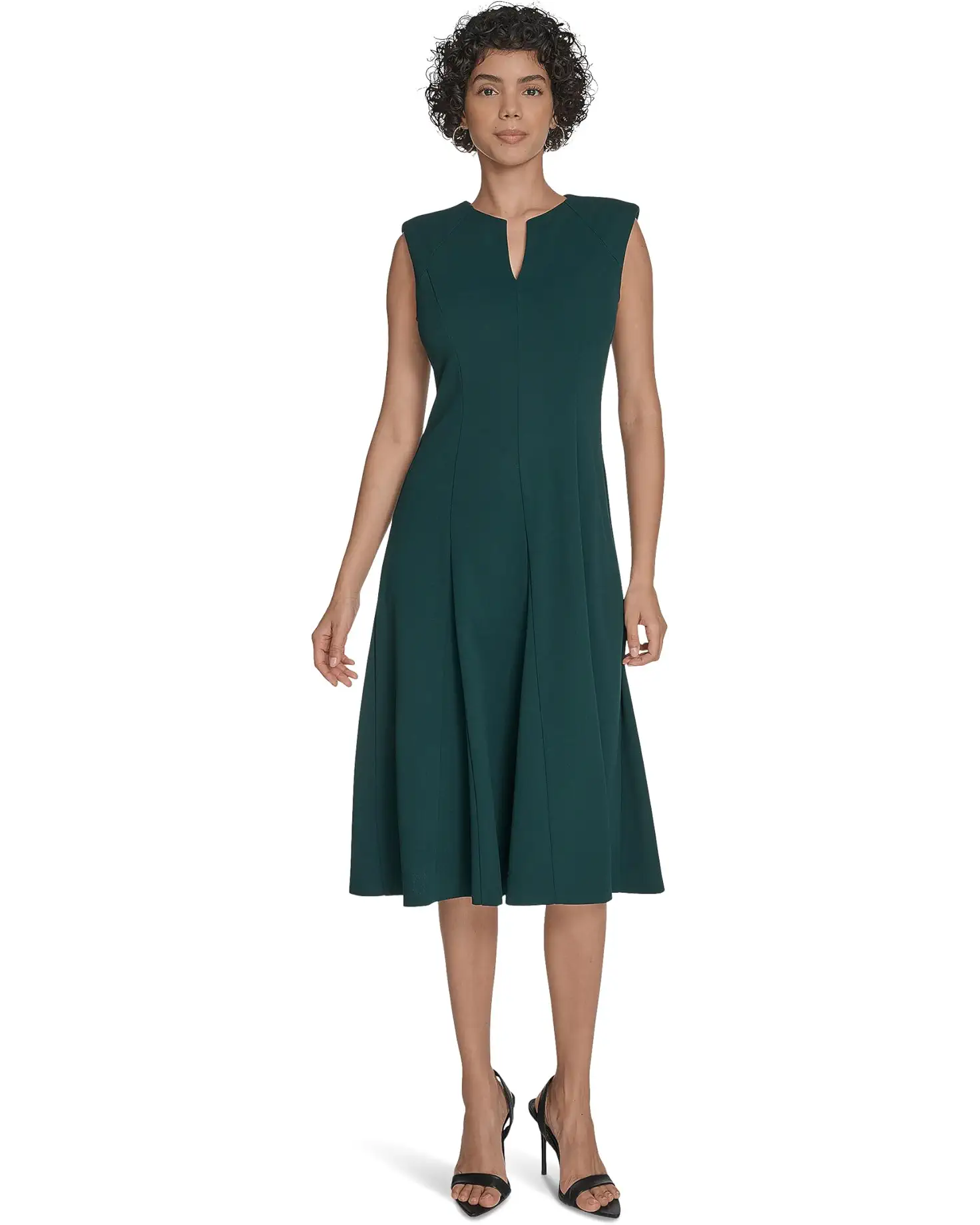 - No matter the occasion, look effortlessly chic in the Calvin Klein® Sleeveless Aline Midi dress. Featuring a split neckline in a sleeveless design with an A-line silhouette and a straight hemline.
