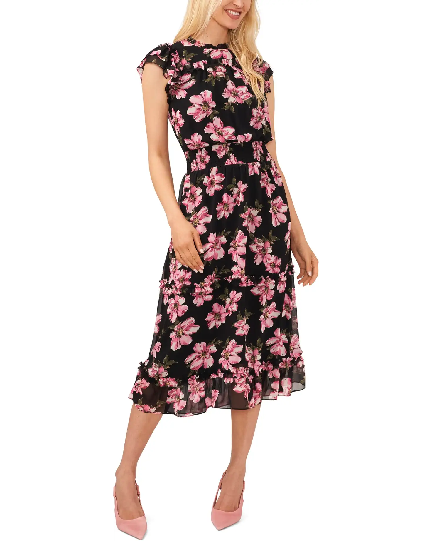 • Look like a doll in the pretty and charming design of the CeCe™ Flutter Sleeve Smocked Waist Dress.