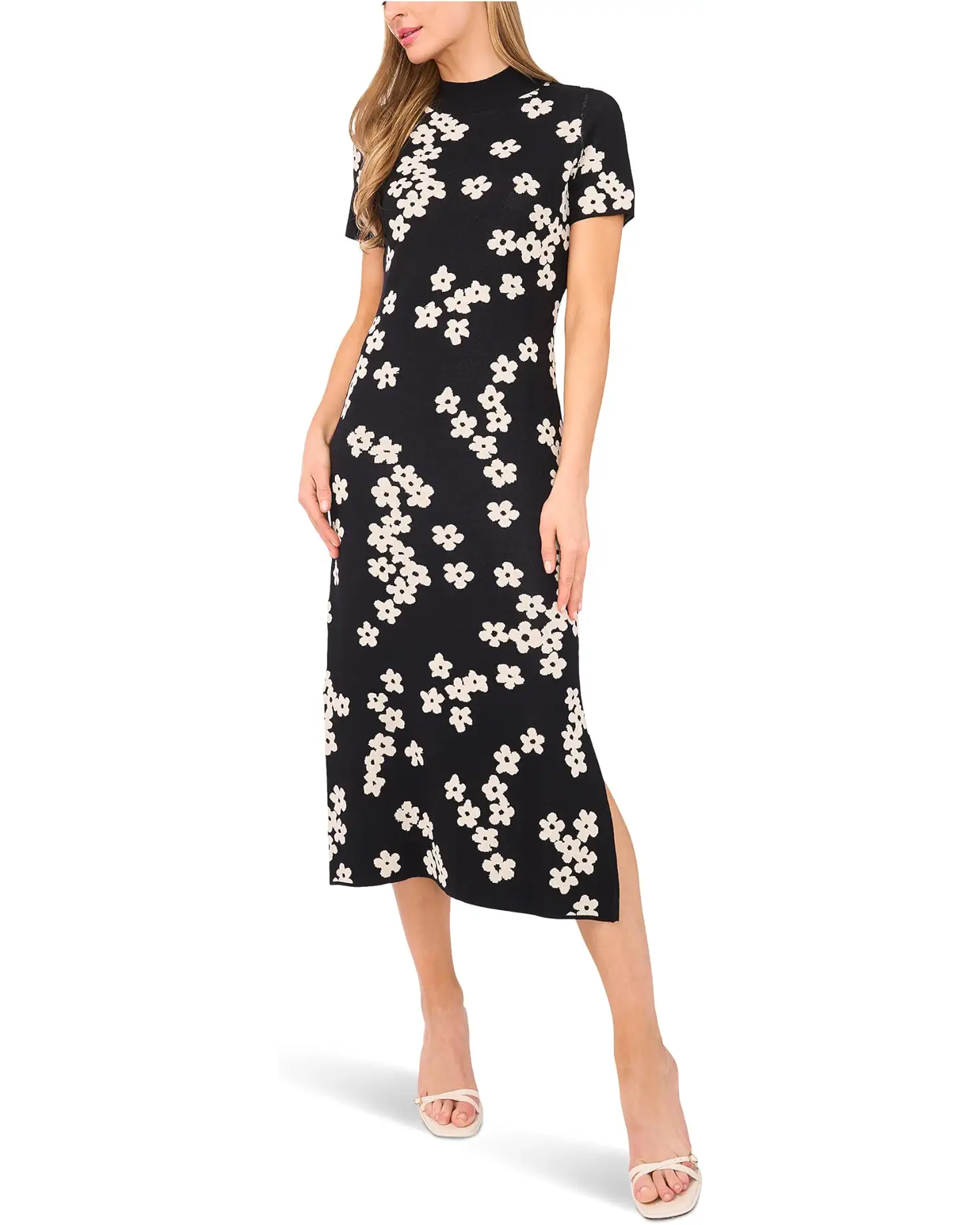 - The CeCe™ Midi Floral Jacquard Knit Dress features a bold black and white flower jacquard print, adding texture and sophistication to its classic body. With short sleeves and a flowing silhouette, it strikes the perfect balance between elegance and ease. The intricate floral pattern elevates the simplicity of the dress, making it a chic choice. It is styled with a mock neckline and a straight hem. Made from ribbed knit fabric, this stunning maxi dress works for different occasions.