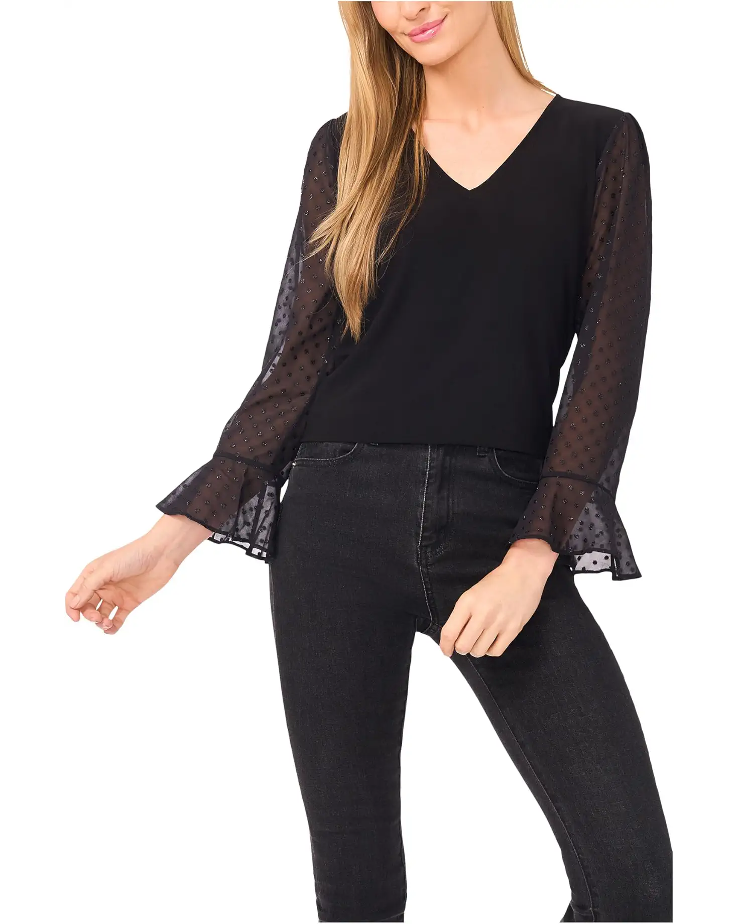 - Add a touch of shimmer to your everyday look choosing the CeCe™ Mixed Media 3/4 Sleeve Knit Top. This effortlessly chic piece features a soft knit body for all-day comfort, while the Lurex® clip chiffon sleeves add a hint of sparkle and elegance. It features a V-neckline, three-quarter-length sleeves, and a straight hem.