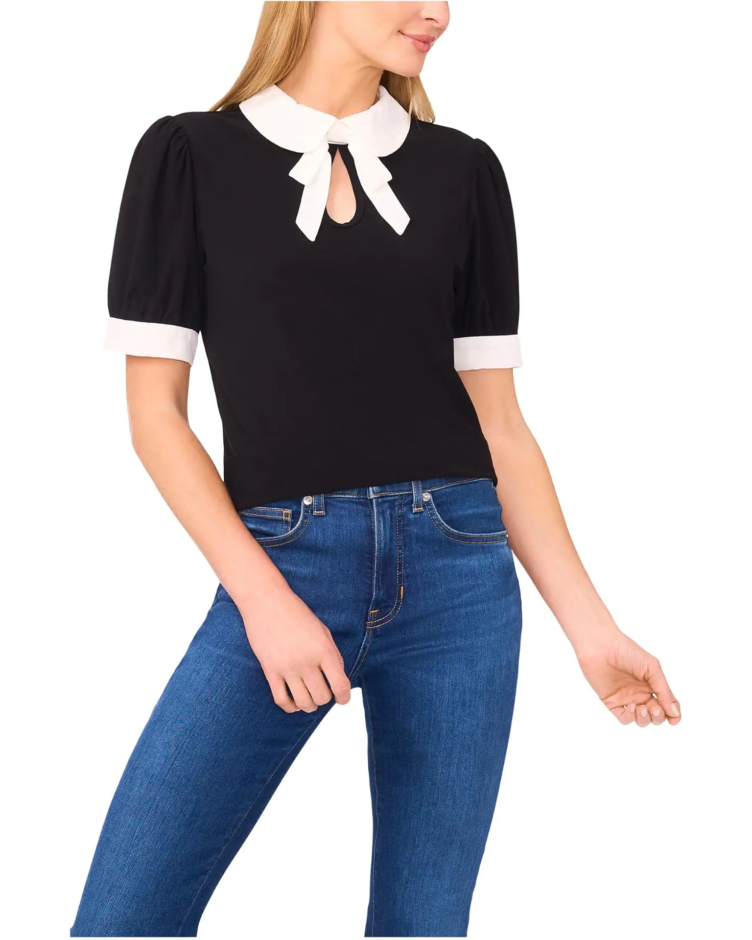 • Vintage-inspired with a modern twist, the CeCe™ Puff Short Sleeve Contrast Collar & Bow Top features short puff sleeves with contrast cuffs, a contrast collar, and a chic bow accent. The button-back closure and straight hem complete the look. It's a perfect statement piece for work or weekend outings.