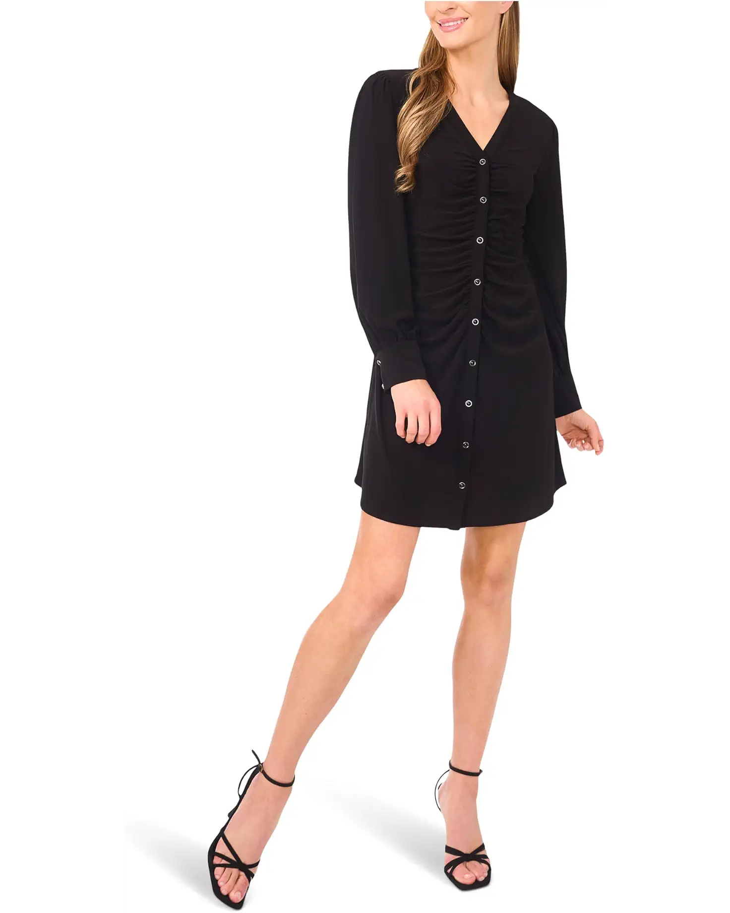 - Feminine and form-fitting, this V-neck dress features a button-down front and shirred body that hugs in all the right places. Long sleeves balance the silhouette for a flattering, wearable fit. Dress it up or down for any occasion on your calendar.