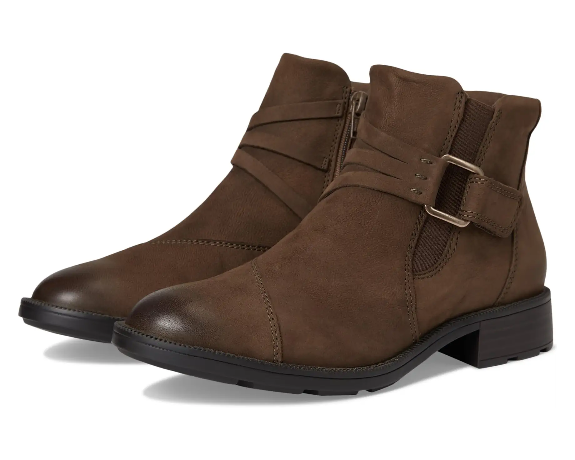 - With distinctive buckle detailing, the Clarks™ Adalynn Faye boots refresh Clarks™ Collection's modern-casual line-up this season. They are crafted with a soft nubuck leather upper for a classic, premium look, while the low stack-effect block heels and metal hardware deliver understated style. Underfoot, a lugged TPR outsole offers practicality and ease, navigating autumnal terrain effortlessly. These ankle-high boots are made of a mesh lining and an ultimate comfort foam footbed that delivers lasting cushioning. The zippered side closure provides easy foot entry, while the buckle strap gives an adjustable, secure fit.