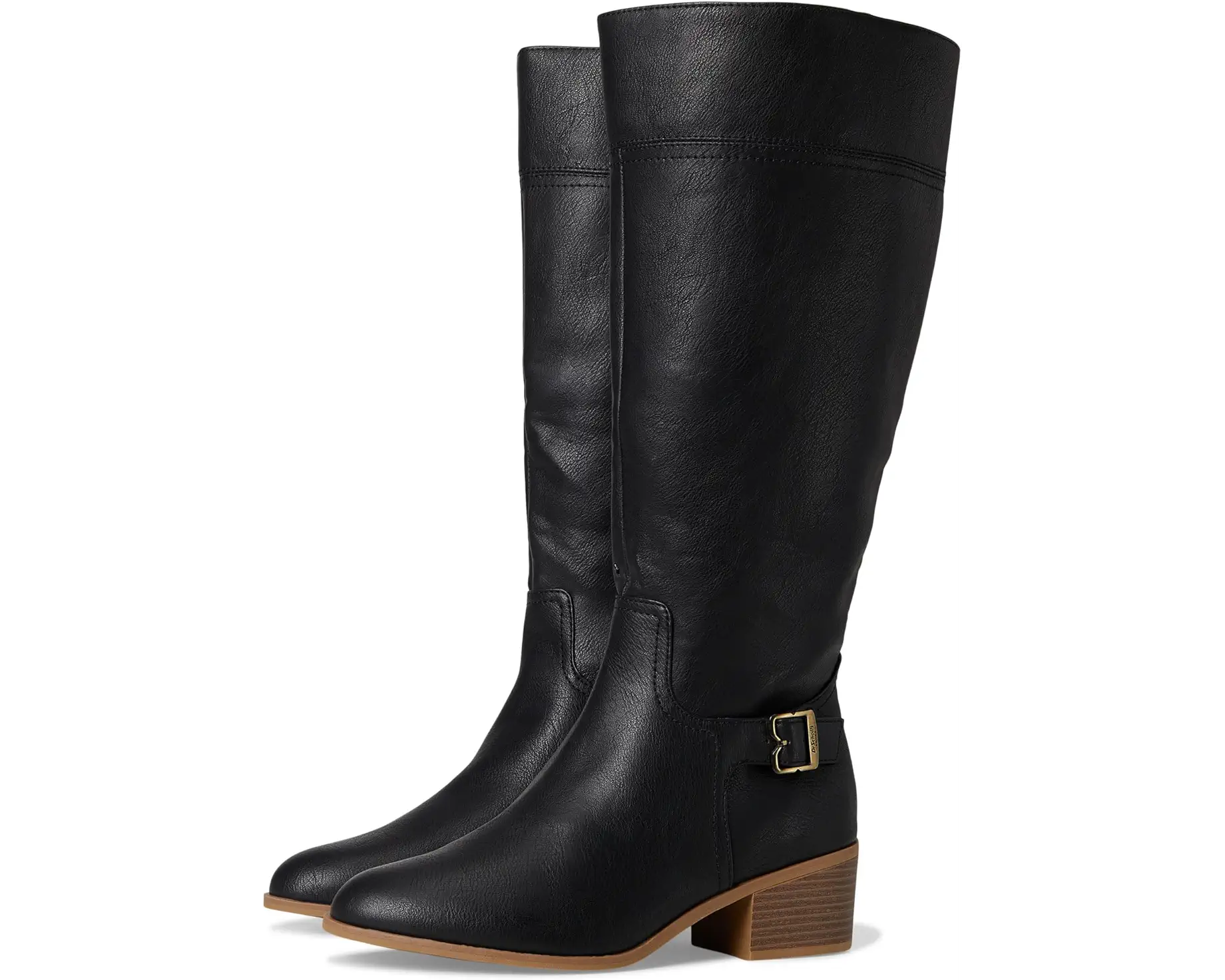 - Riding boots for women designed with innovative comfort. Crafted from a faux leather upper, these boots offer an inside zipper for a secure fit, iconic buckle detailing, stitch accents, and a stacked heel.