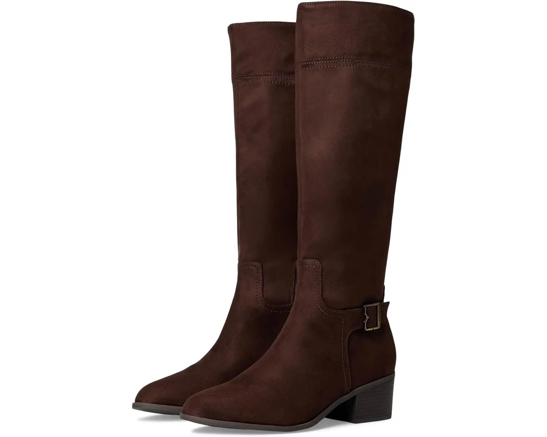 - Riding boots for women designed with innovative comfort. Crafted from a faux leather upper, these boots offer an inside zipper for a secure fit, iconic buckle detailing, stitch accents, and a stacked heel.