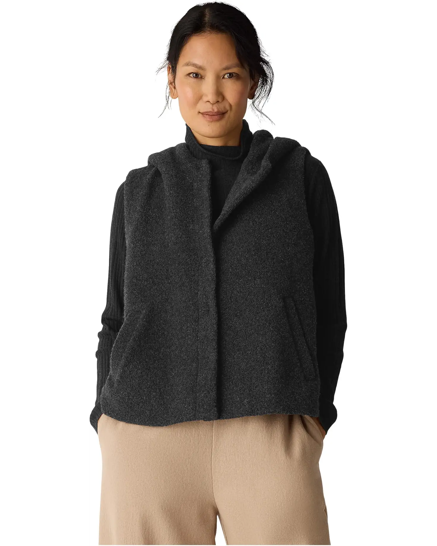 - The Eileen Fisher® Cozy Recycled Wool Boucle Hooded Vest comes in a soft and luxurious boucle knit fabric, updated with recycled wool. Plush, dense, and surprisingly light, this pullover has PrimaLoft recycled polyester fill for cozy comfort. The sweater features a hooded neck, a snap-button closure, a sleeveless design, two hand pockets, and a straight hem.