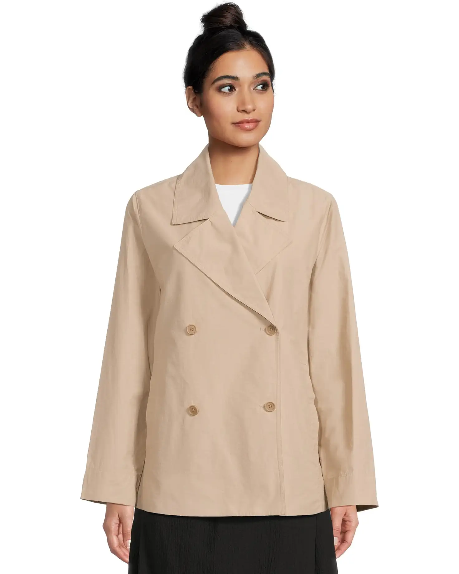 - A sporty yet sophisticated weave, the Eileen Fisher® Light Cotton Nylon Notch Collar Trench Coat has been a choice for lightweight outerwear since 2000. Now made with a lightweight cotton and nylon blend, this trench coat is styled with long sleeves, a buttoned front closure, a notch collar, and a straight hem.