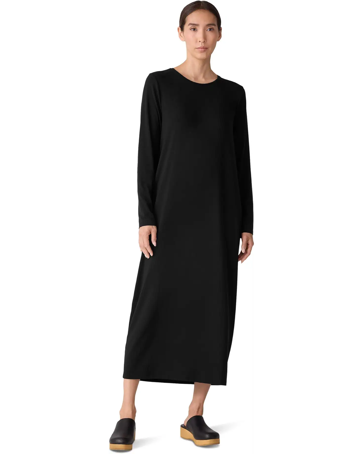 - Fluid and polished, the Eileen Fisher® Stretch Jersey Knit Full Length Oval Dress is a medium-weight jersey that moves effortlessly from day to night. The pull-on style dress features a crew neck, long sleeves, and a calf-length silhouette.