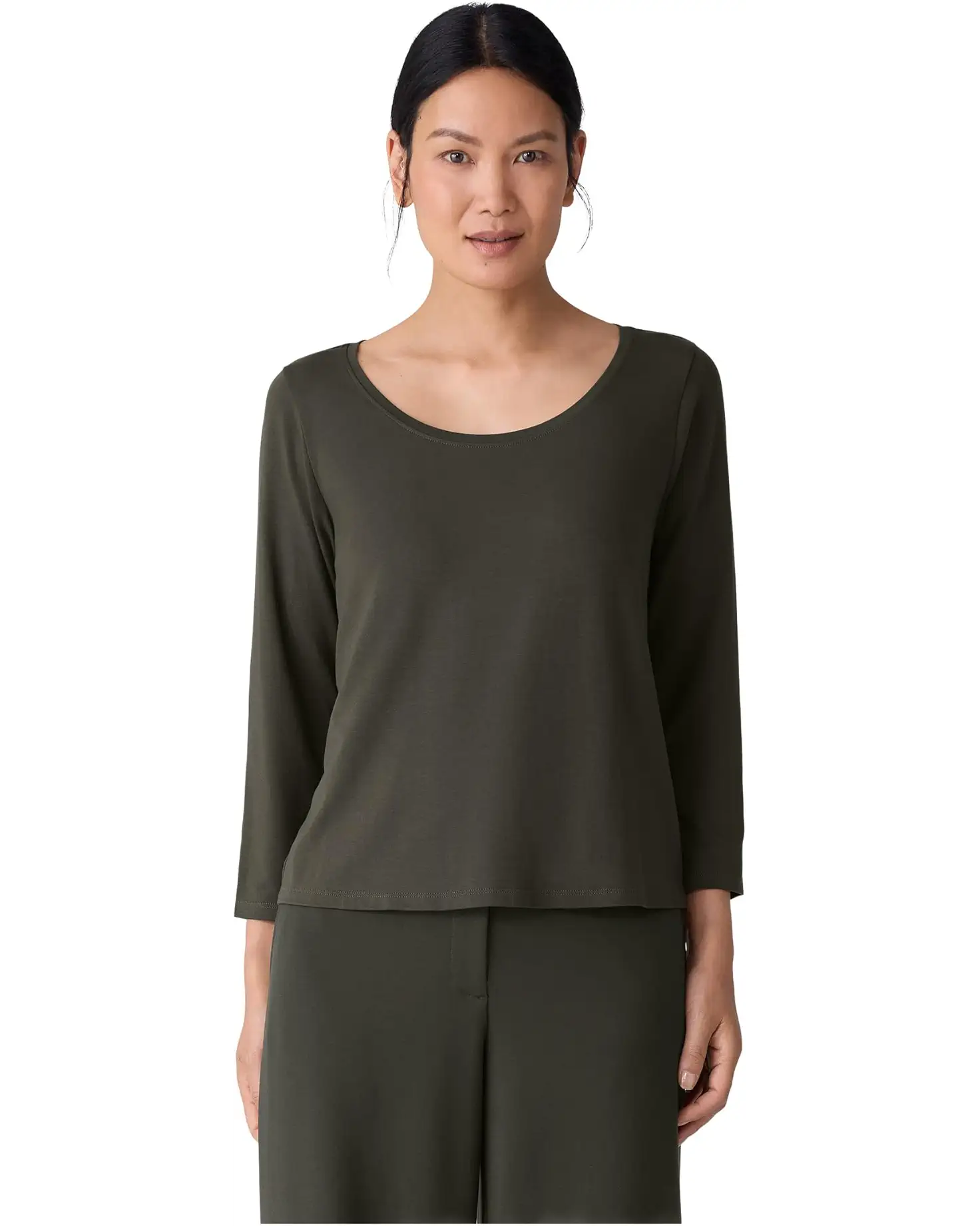 • Fluid and polished, the Eileen Fisher® Stretch Jersey Knit Scoop Neck Top is a medium-weight jersey top that moves effortlessly from day to night. Its stretch jersey knit fabric provides long-lasting comfort. This knit top is styled with elbow-length sleeves, a scoop neckline, and a straight hem, making it ideal for everyday wear.